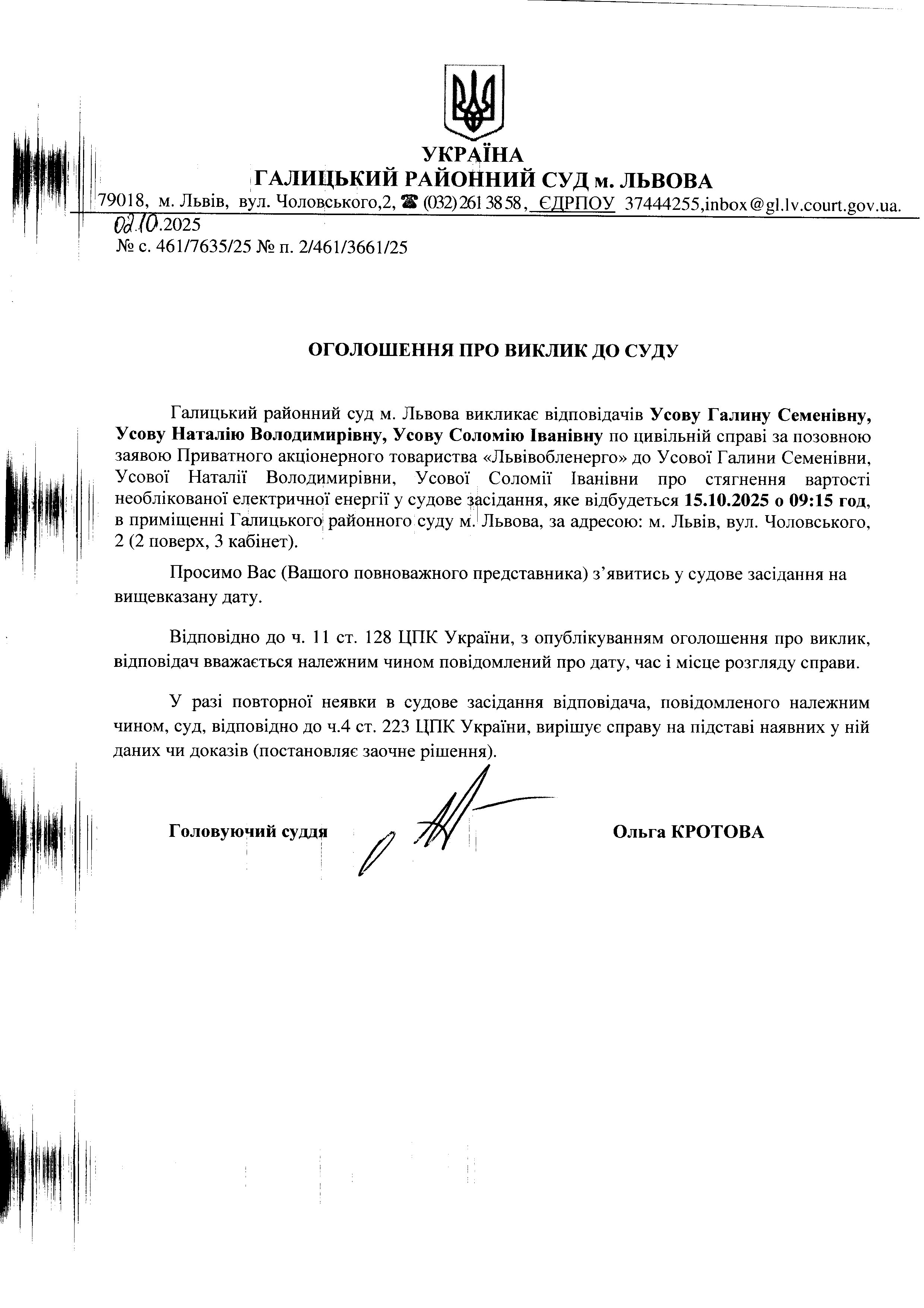 оголошення про виклик Усової Г.С., Усової Н.В., Усової С.І.