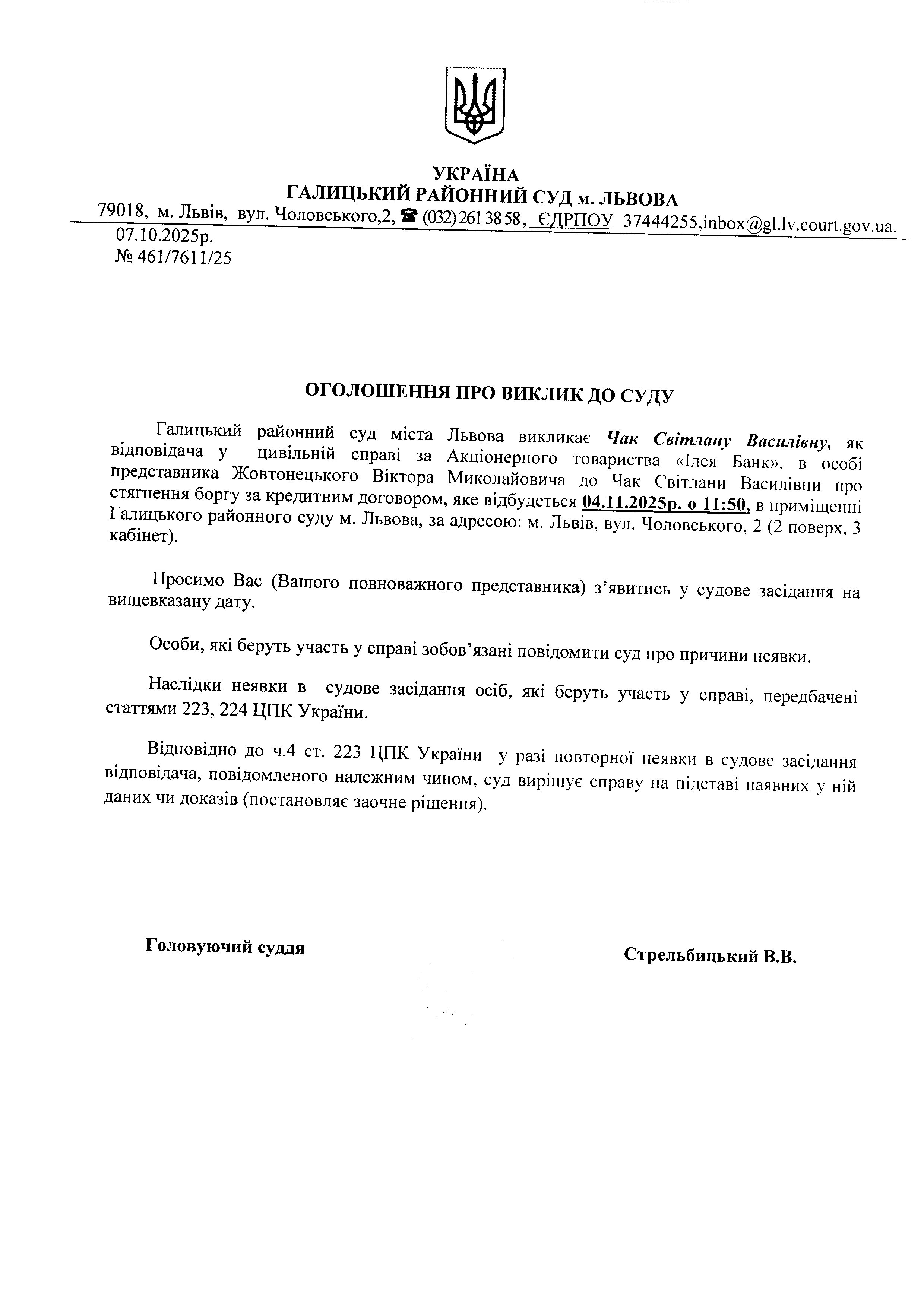 оголошення про виклик Чак С.В.