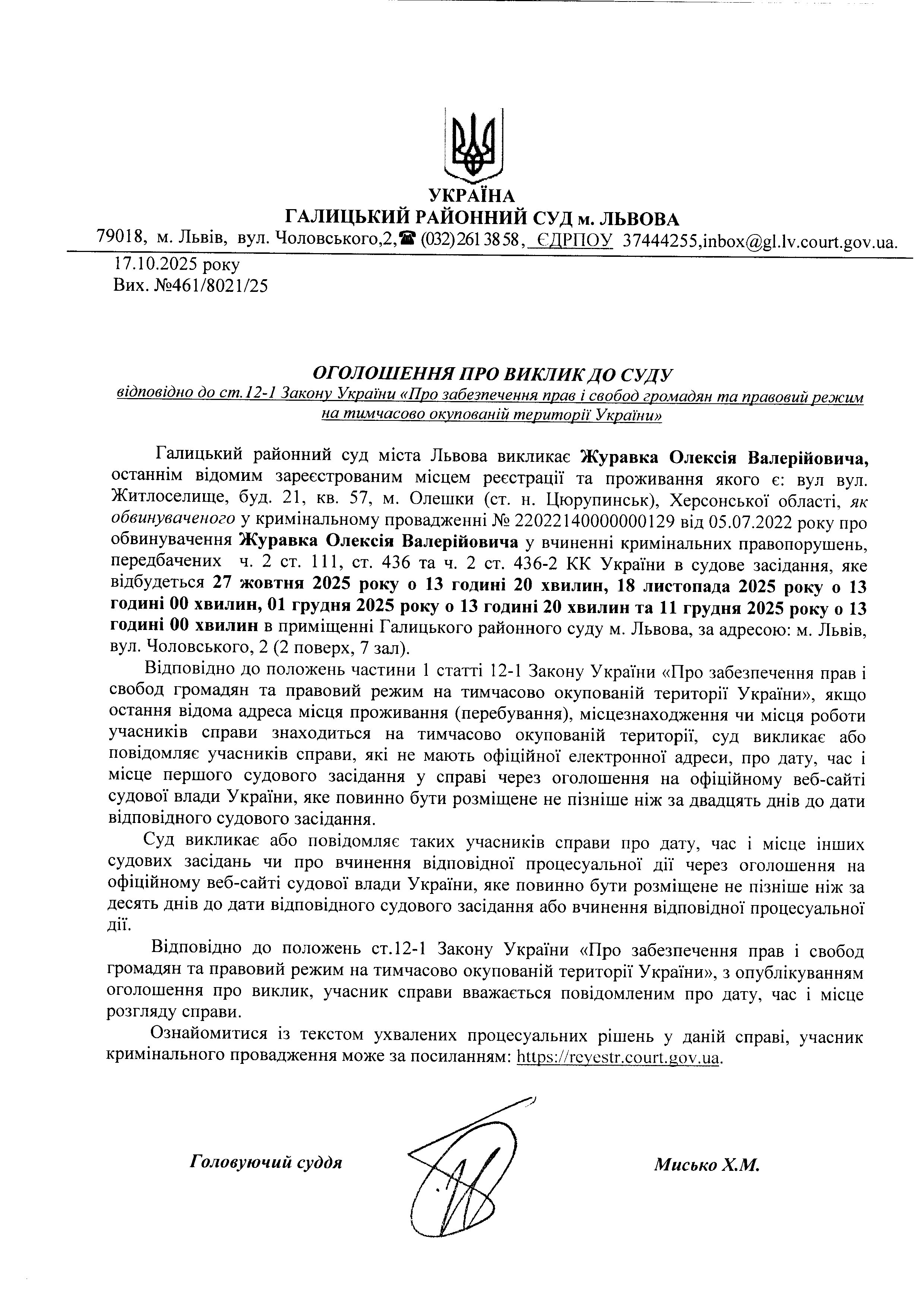 оголошення про виклик Журавка О.В.