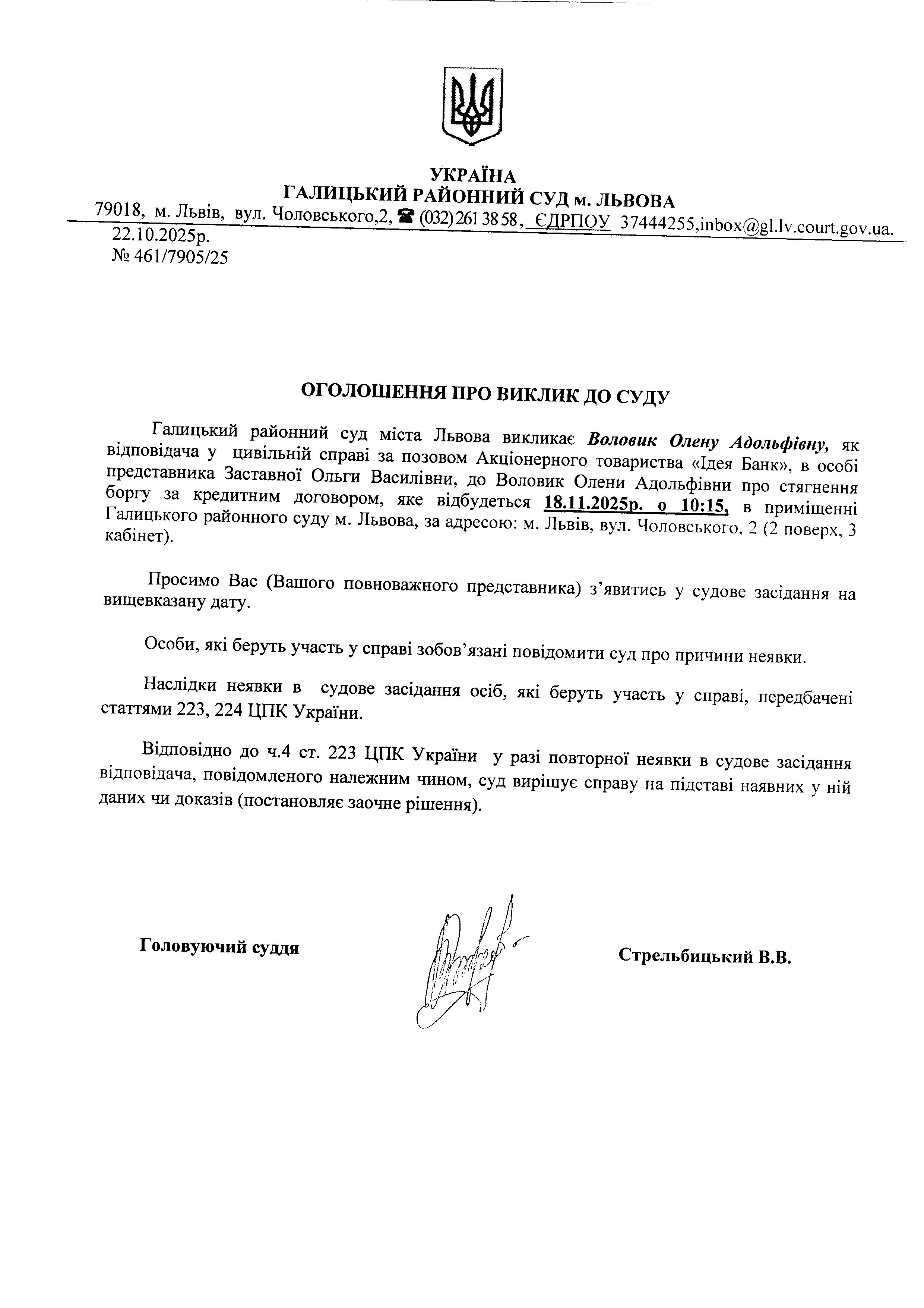 оголошення про виклик Воловик О.А.