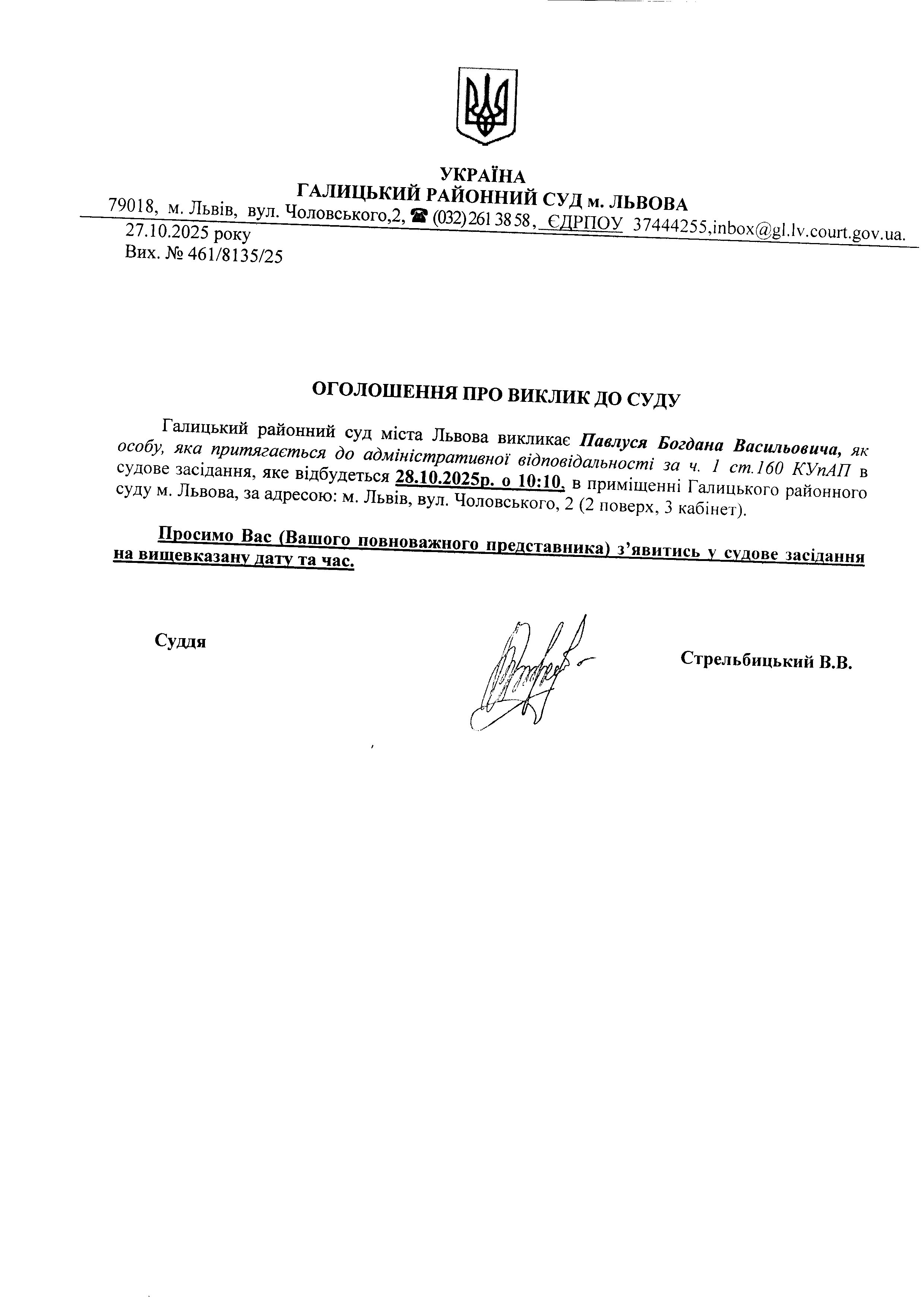 оголошення про виклик Павлуся Б.В.