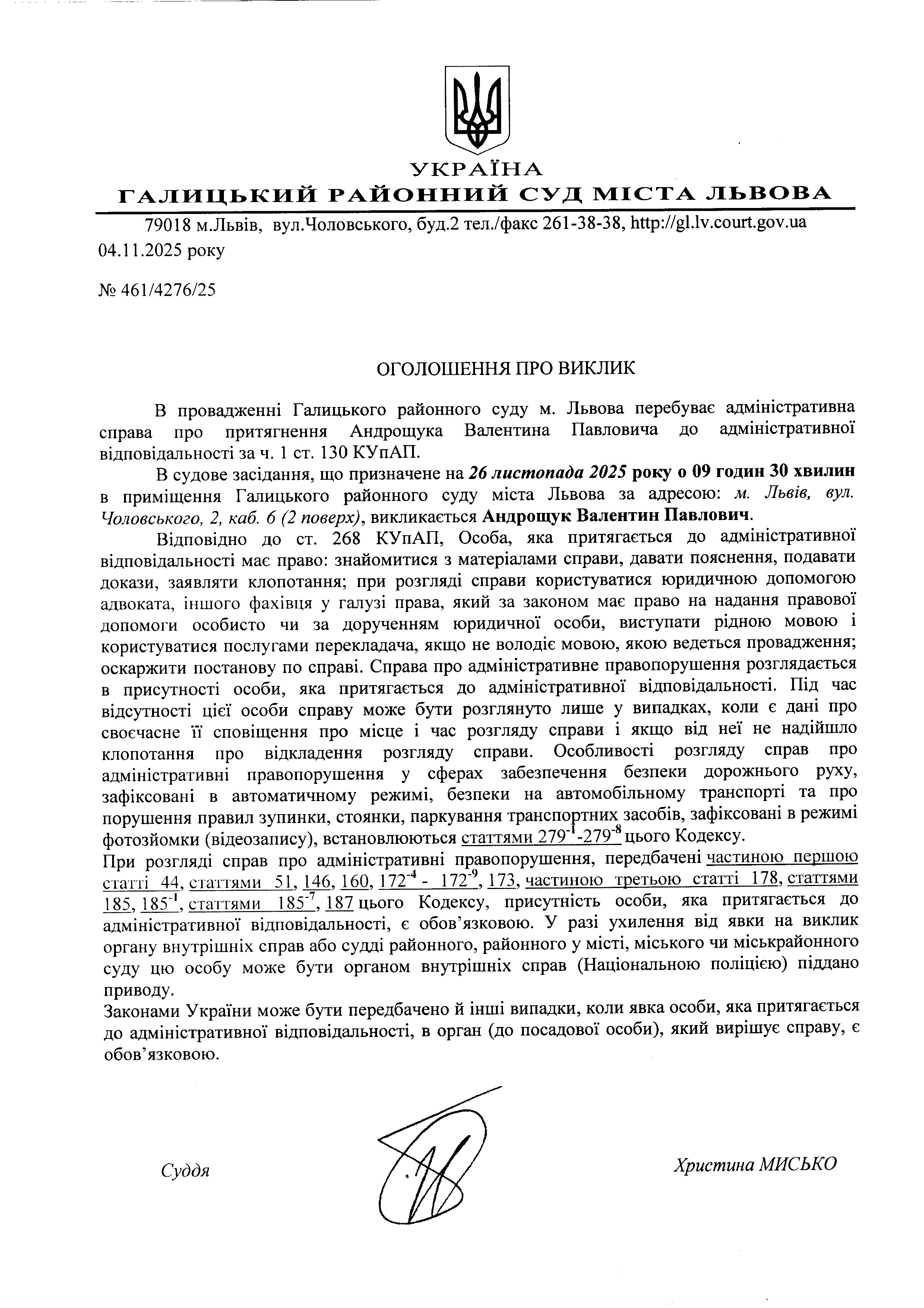 оголошення про виклик Андрощука В.П.