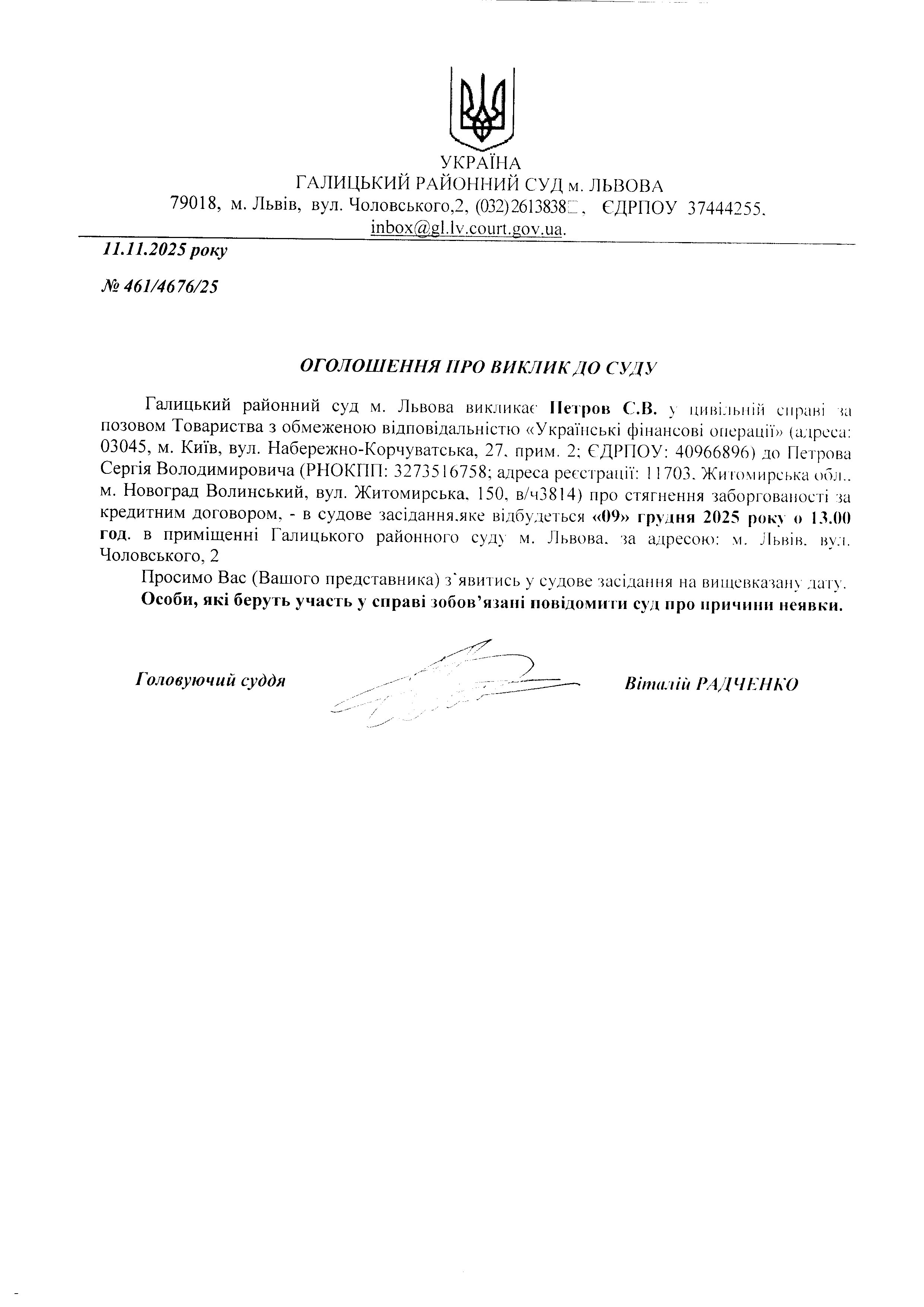 оголошення про виклик Петров С.В.