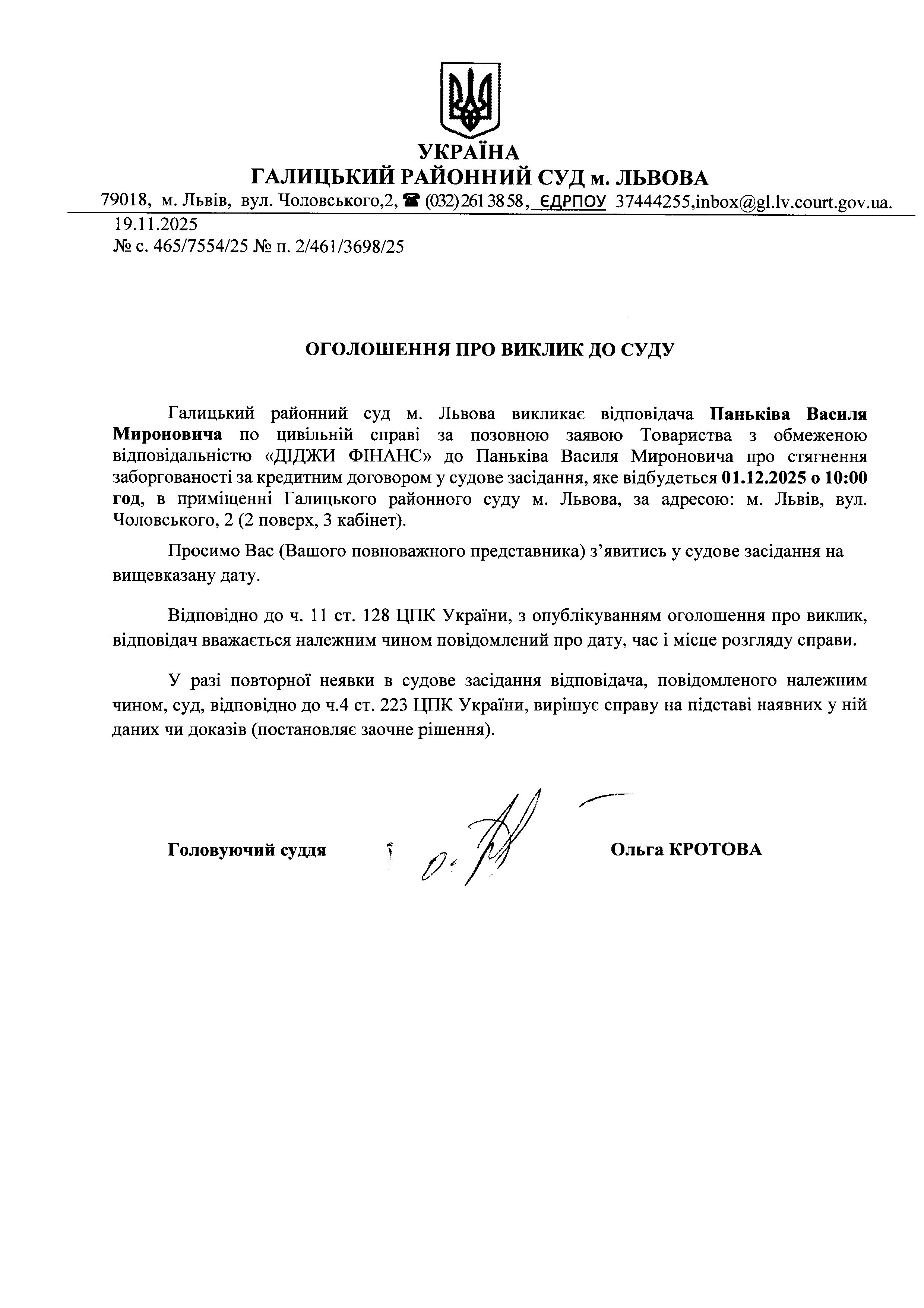 оголошення про виклик Паньківа В.М.