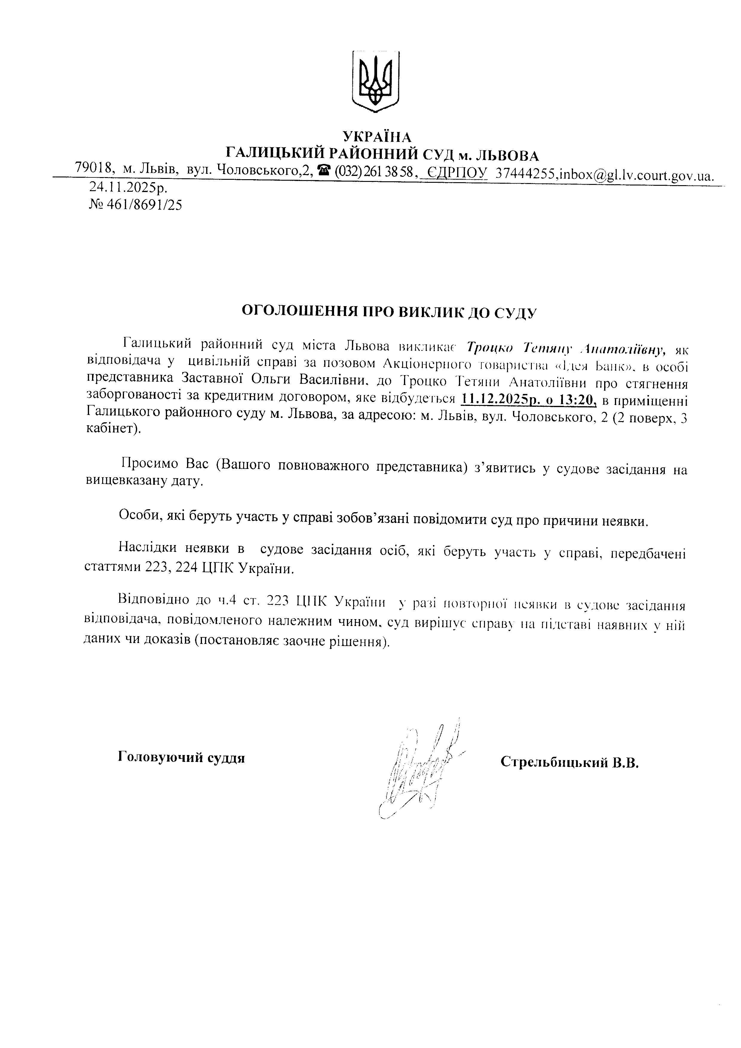 оголошення про виклик Троцко Т.А.