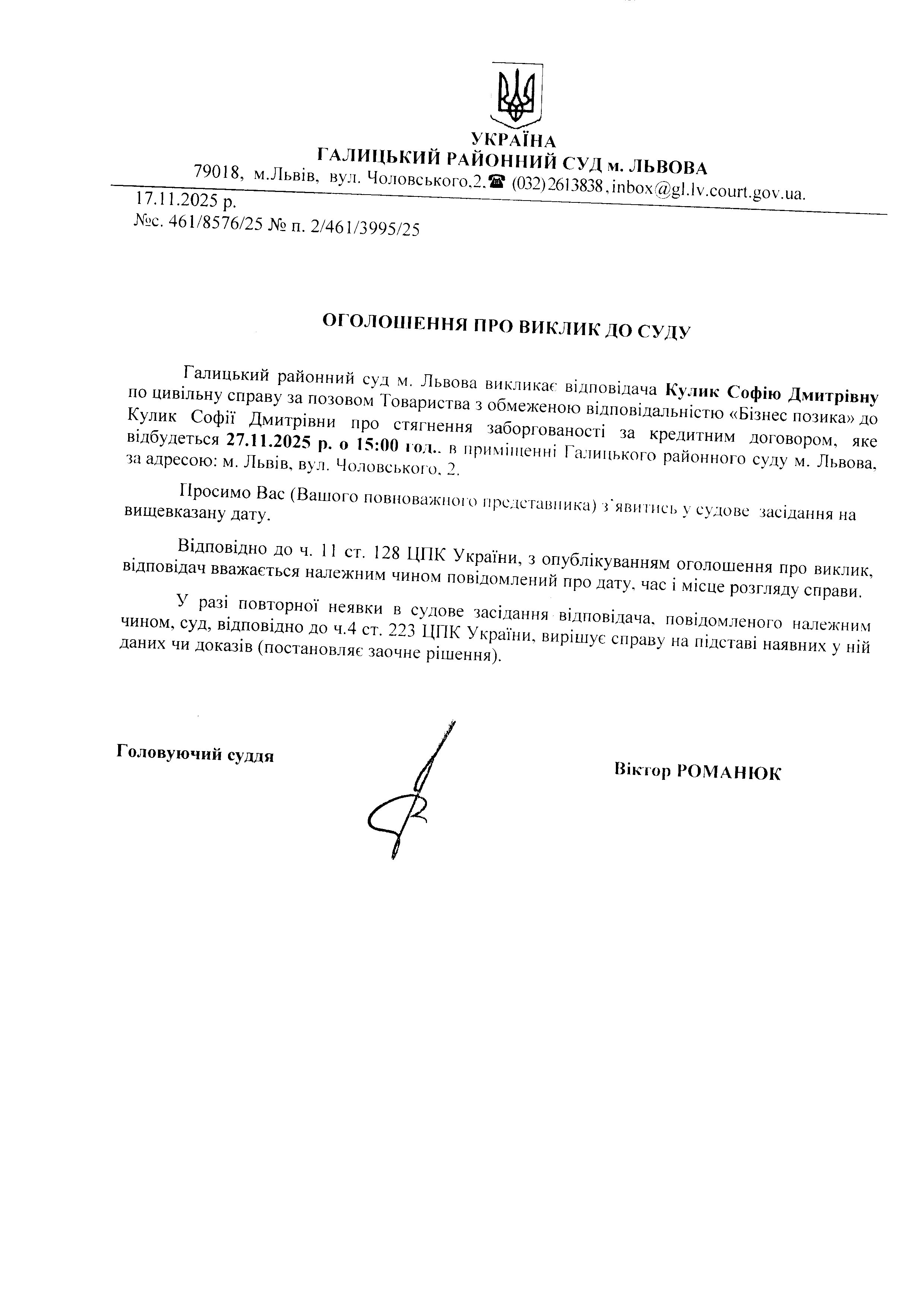 оголошення про виклик Кулик С.Д