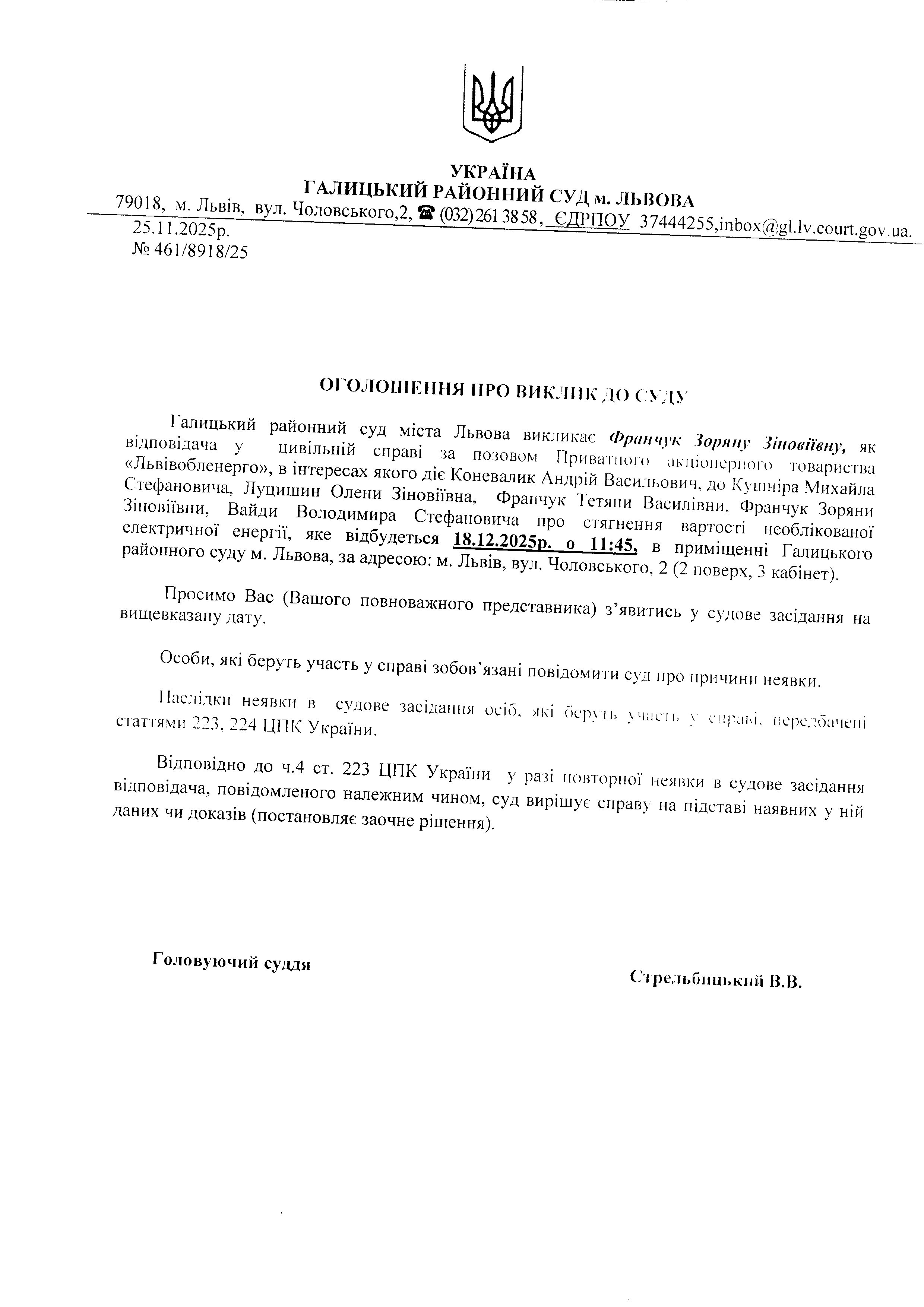оголошення про виклик Франчук З.З.