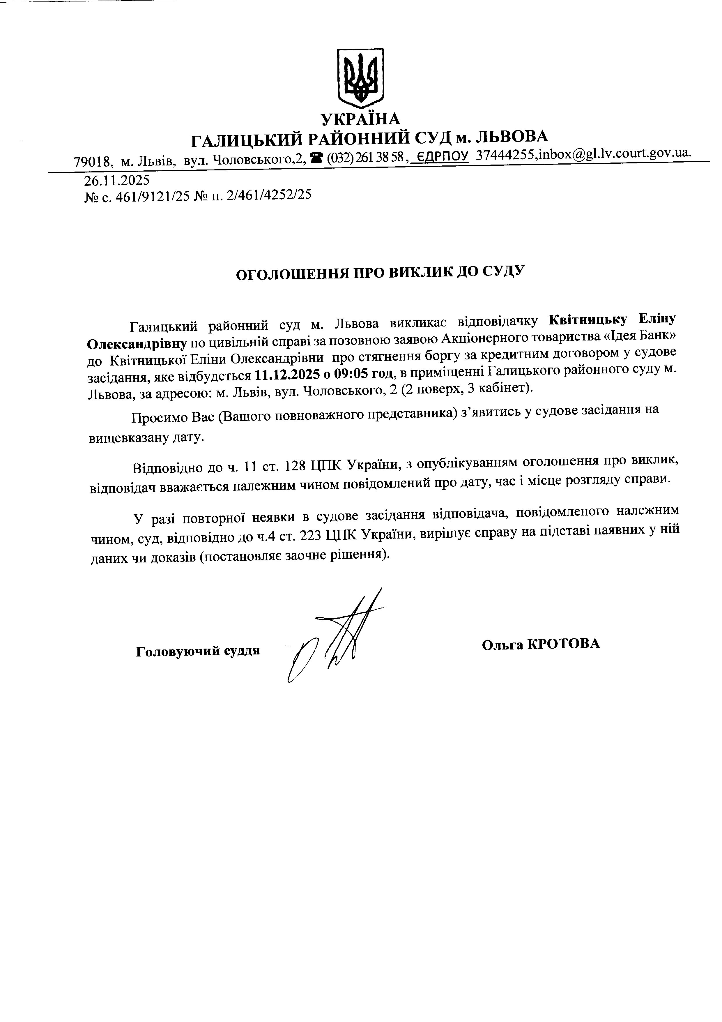 оголошення про виклик Квітницьку Е.О.