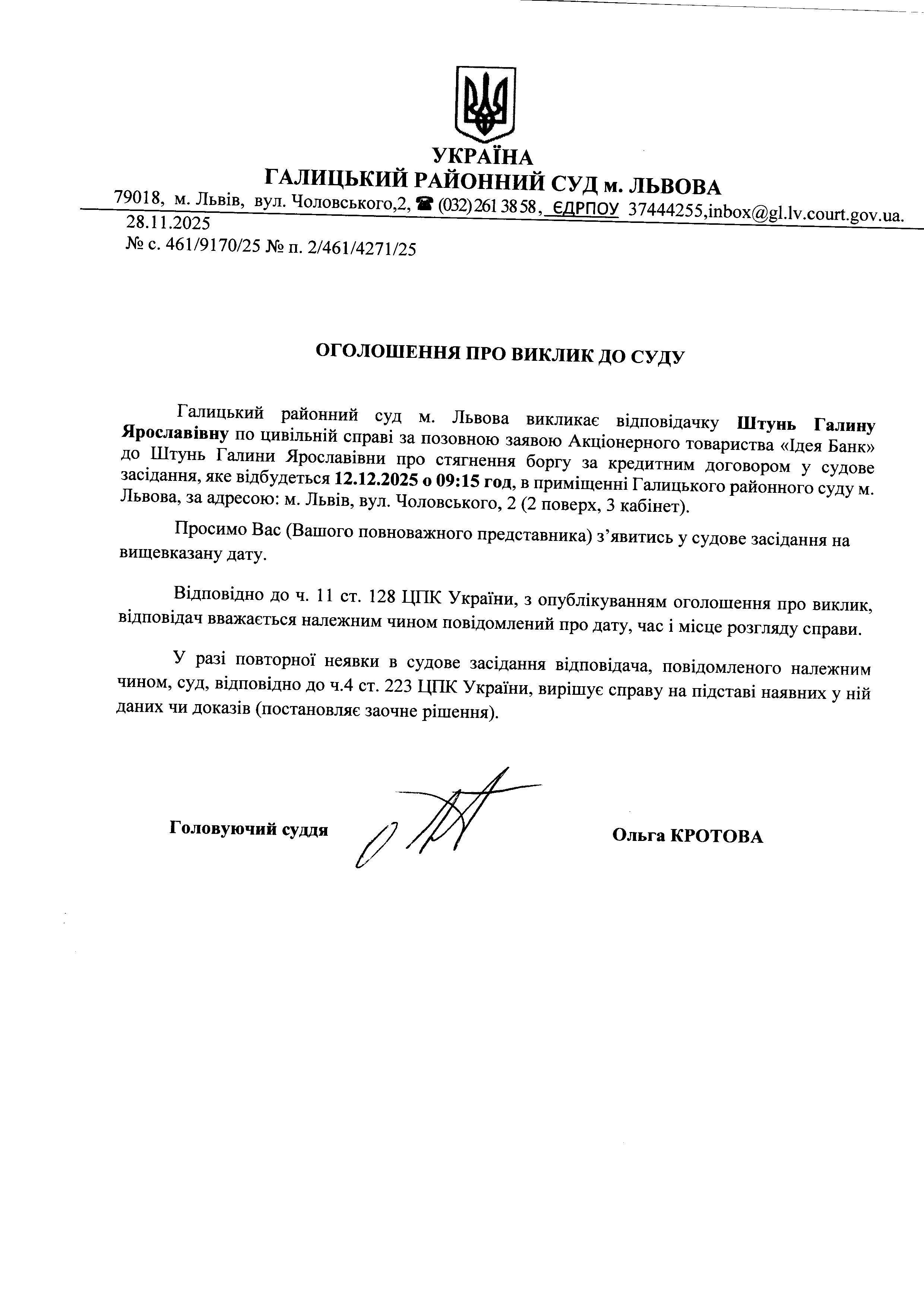 оголошення про виклик Штунь Г.Я.