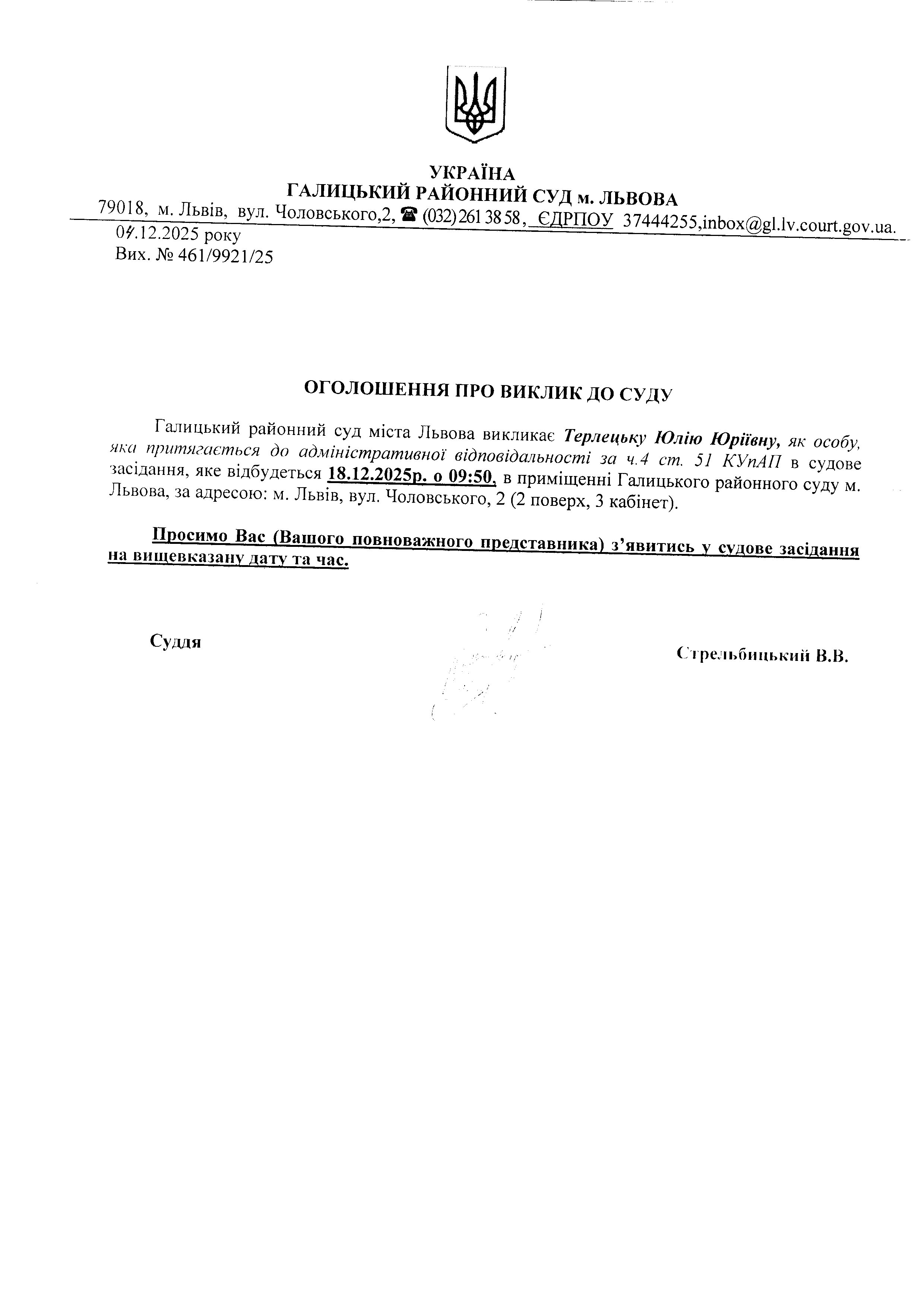 оголошення про виклик Терлецьку Ю.Ю.