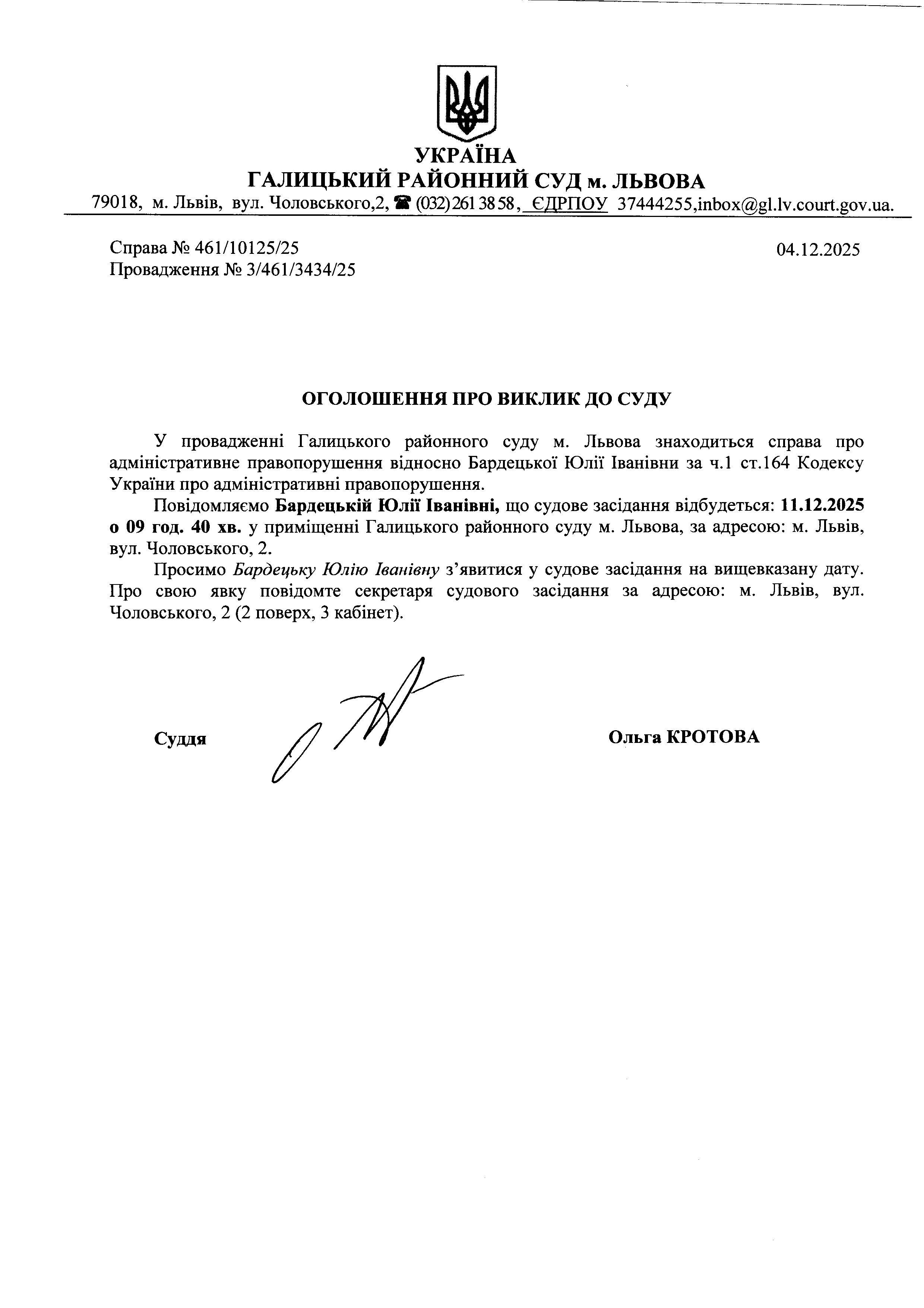 оголошення про виклик Барделецької Ю.І.