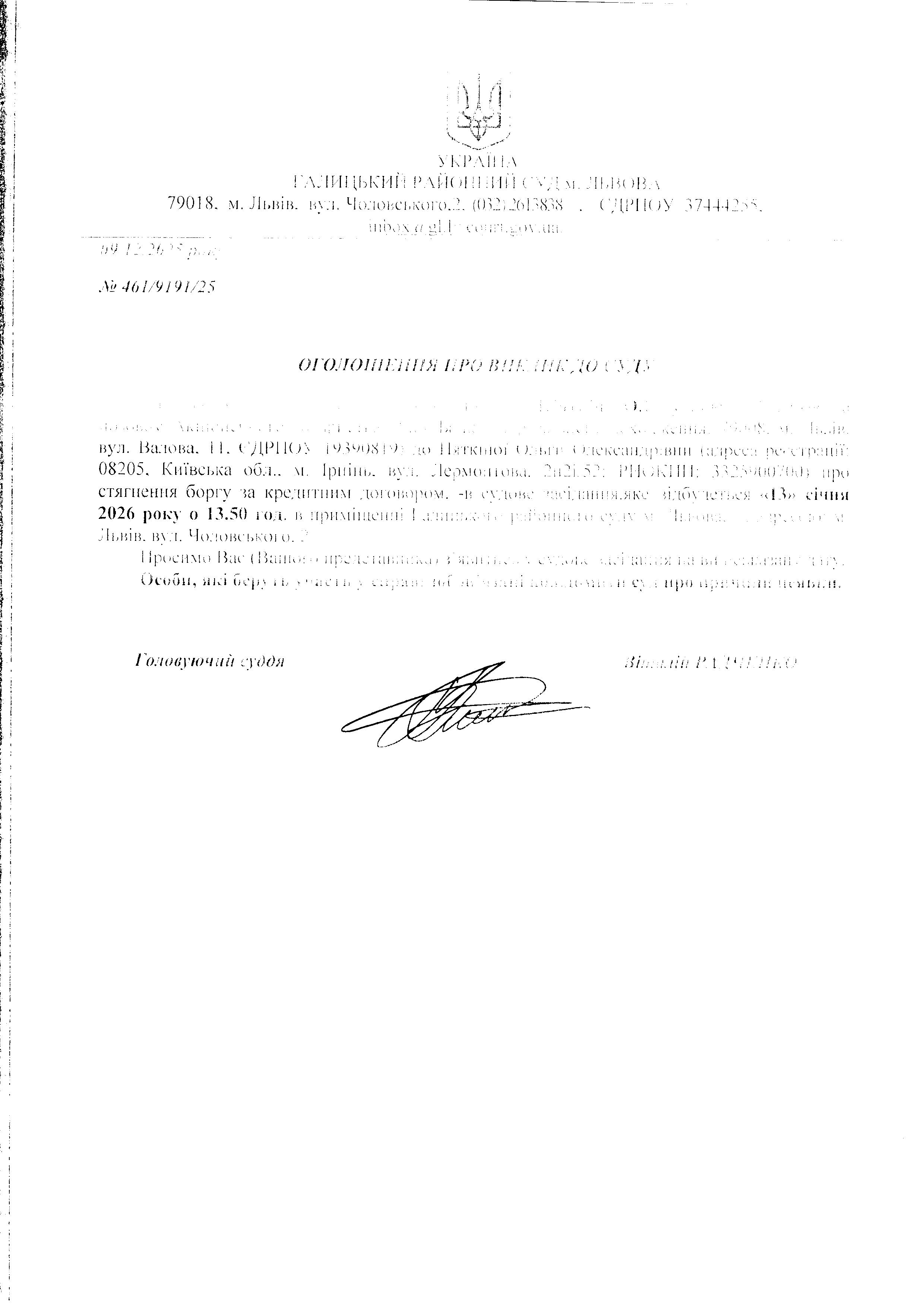 оголошення про виклик П'яткіна О.О.