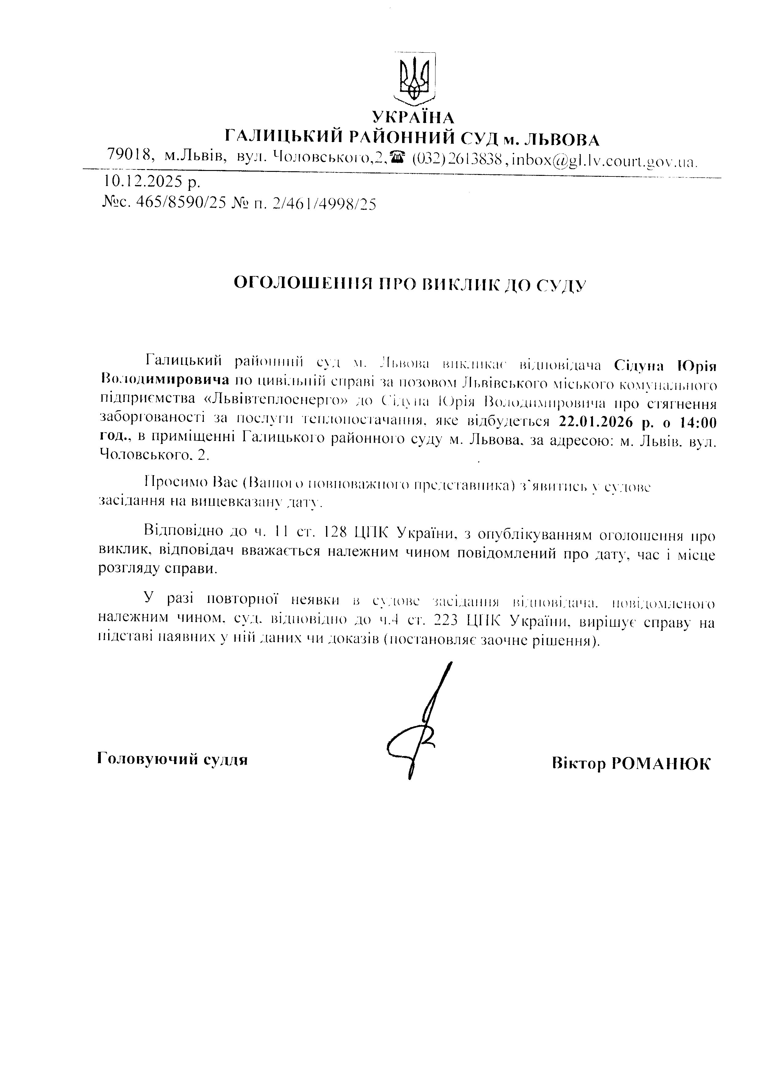 оголошення про виклик Сідуна Ю.В.