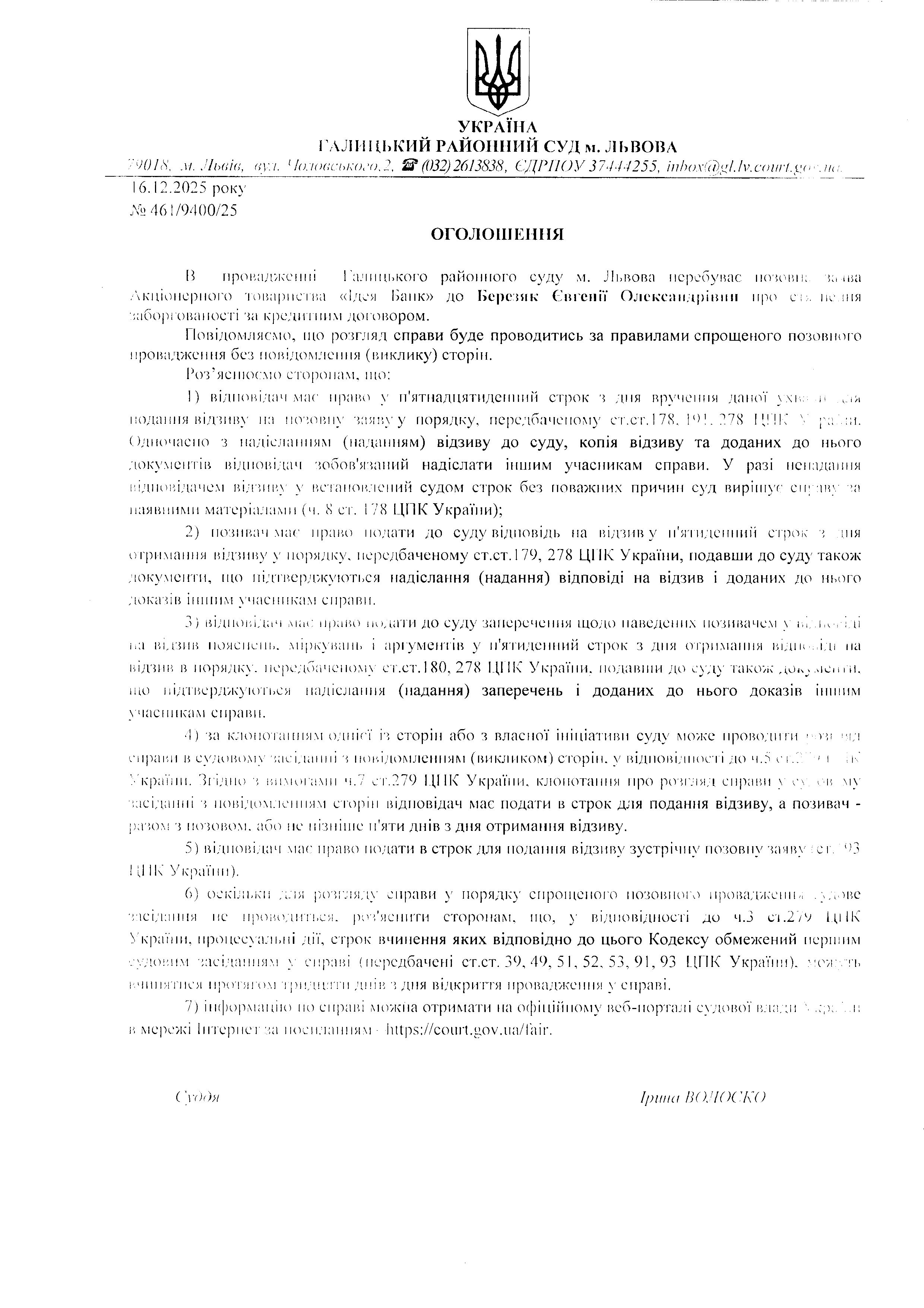 оголошення про виклик Березяк Є.О.