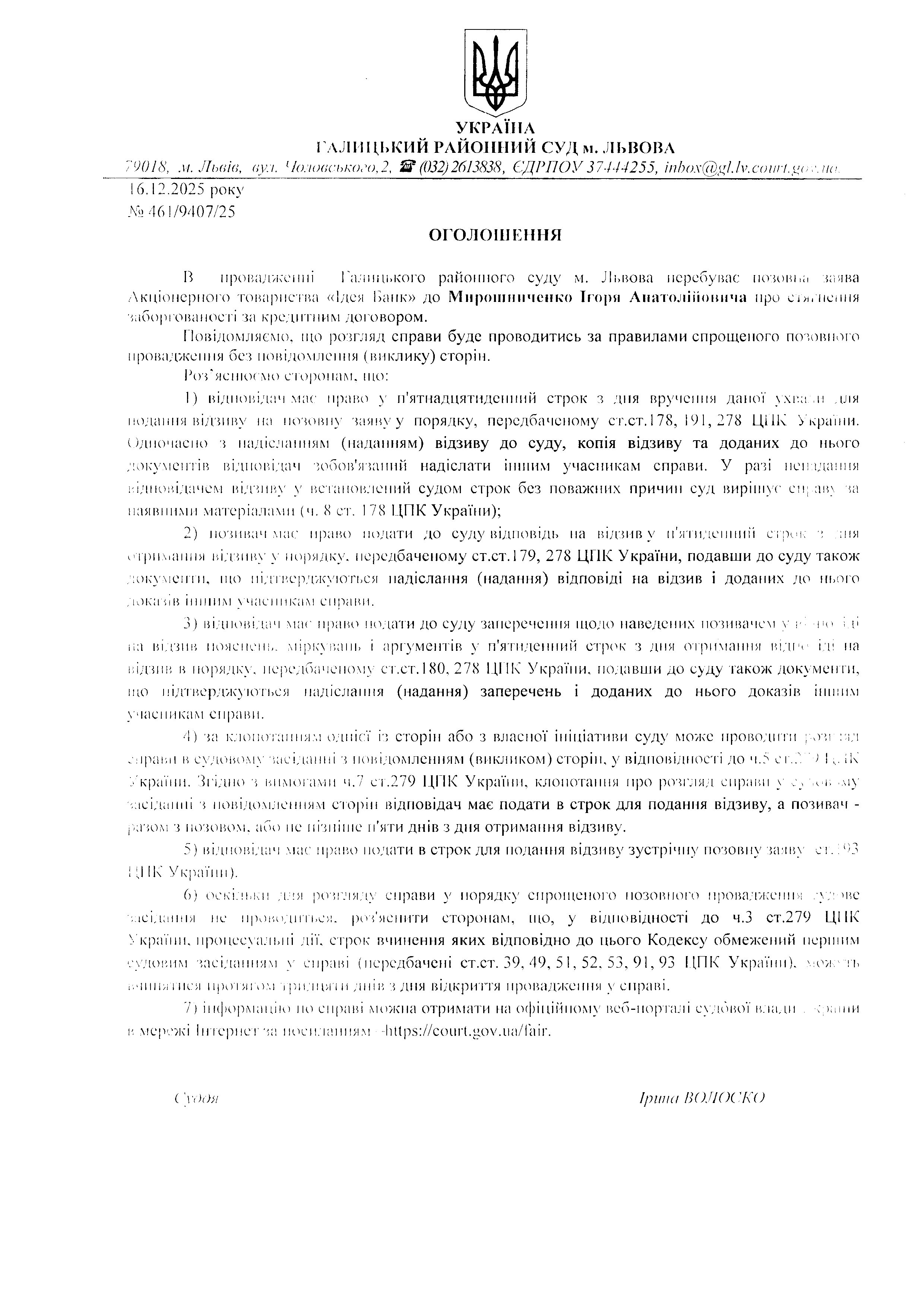 оголошення про виклик Мирошниченко І.А.
