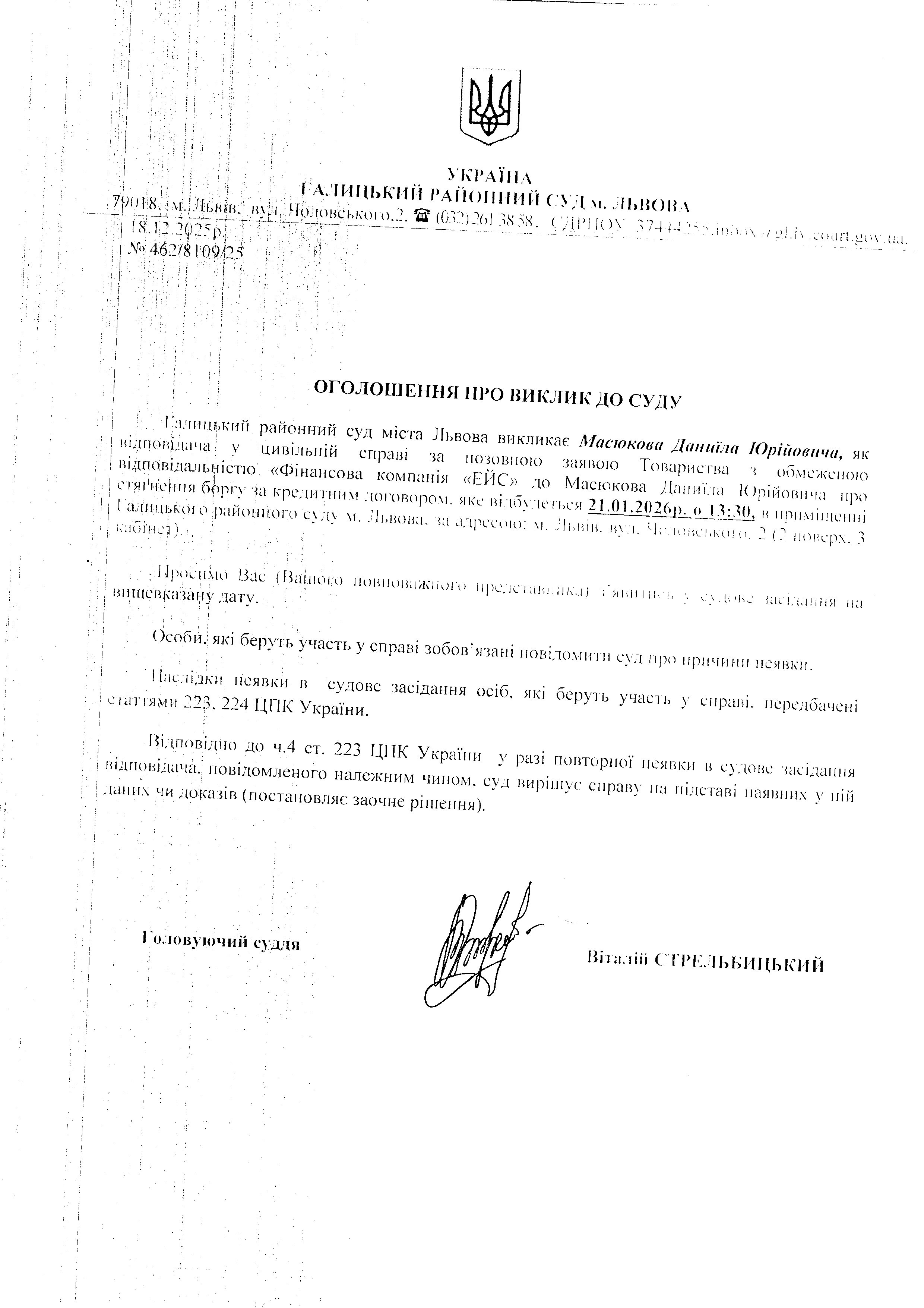 оголошення про виклик Маслюкова Д.Ю.