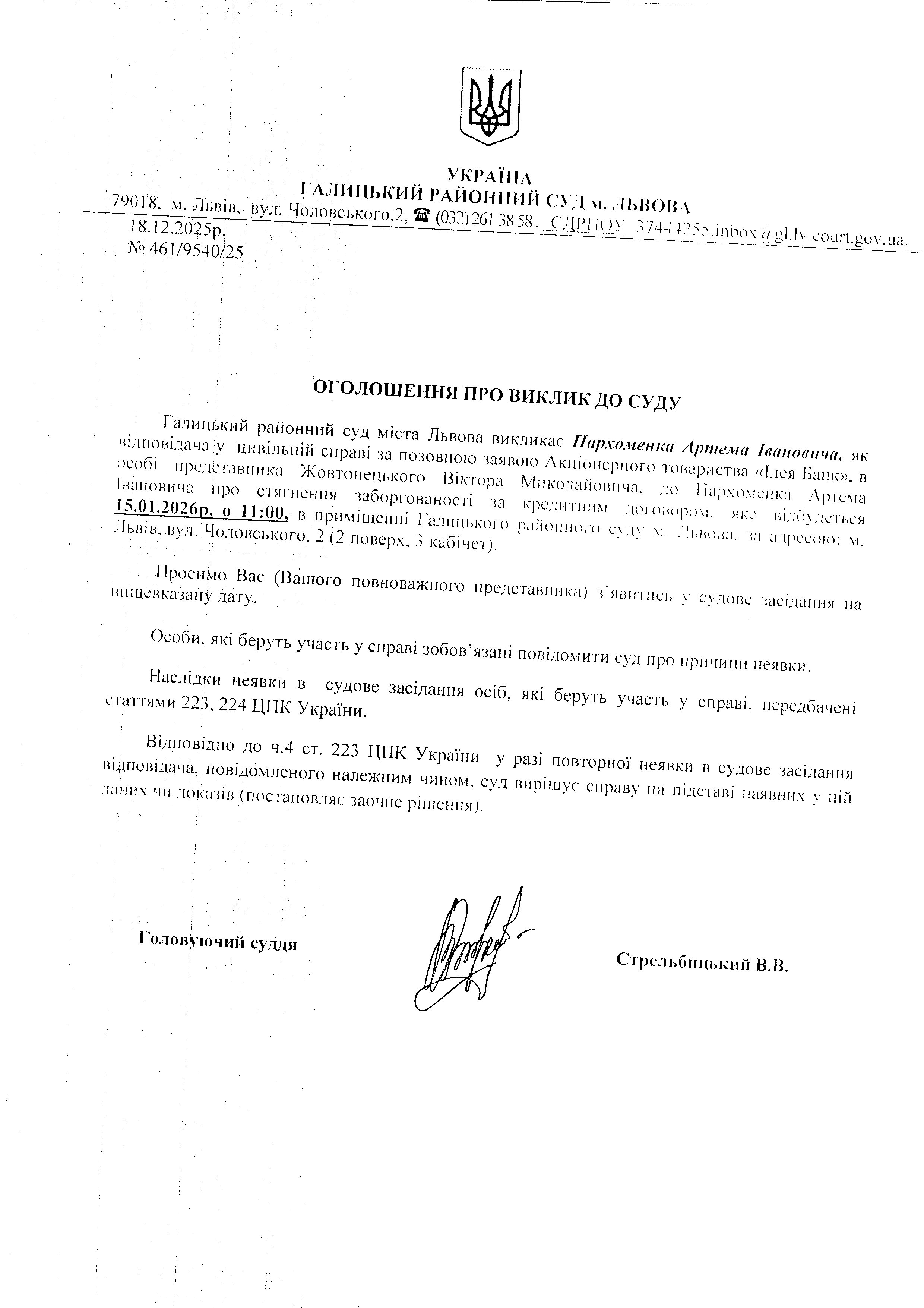 оголошення про виклик Пархоменка А.І.