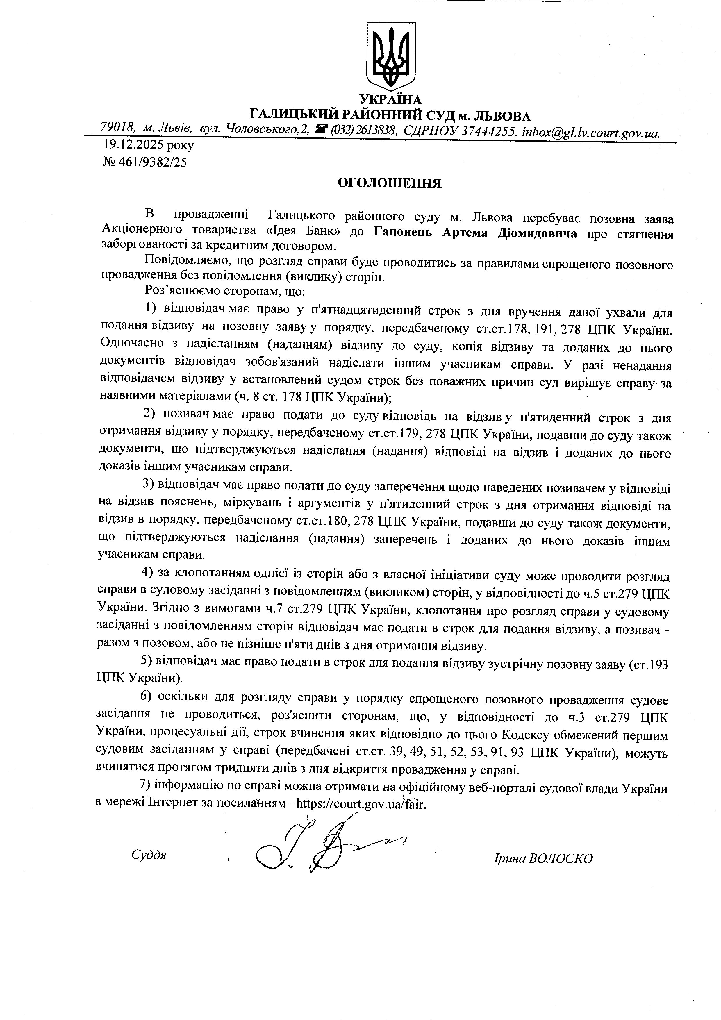 оголошення про виклик Гапонець А.Д.