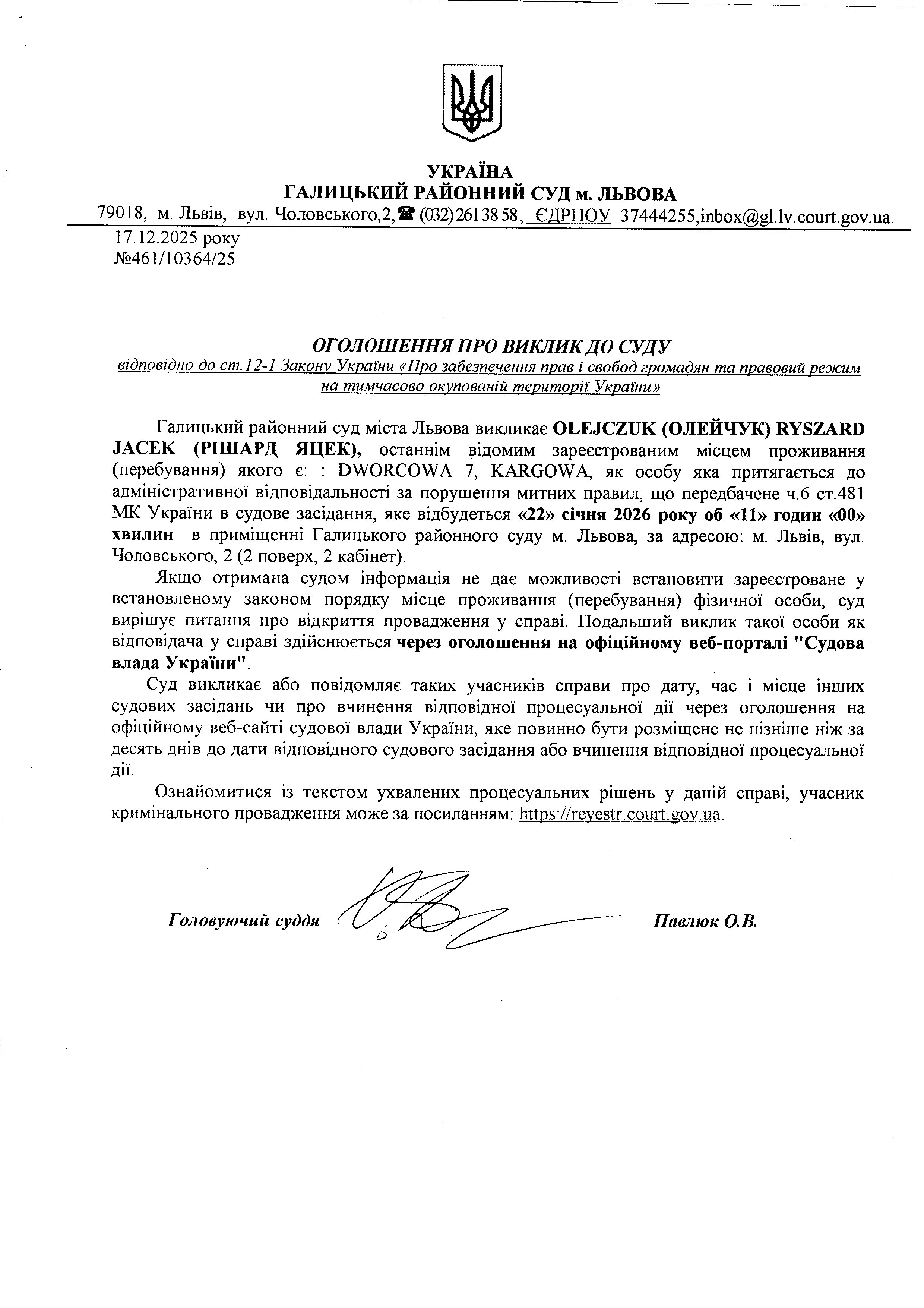 оголошення про виклик OLEJCZUK RYSZARD JACEK Олейчук Рішард Яцек