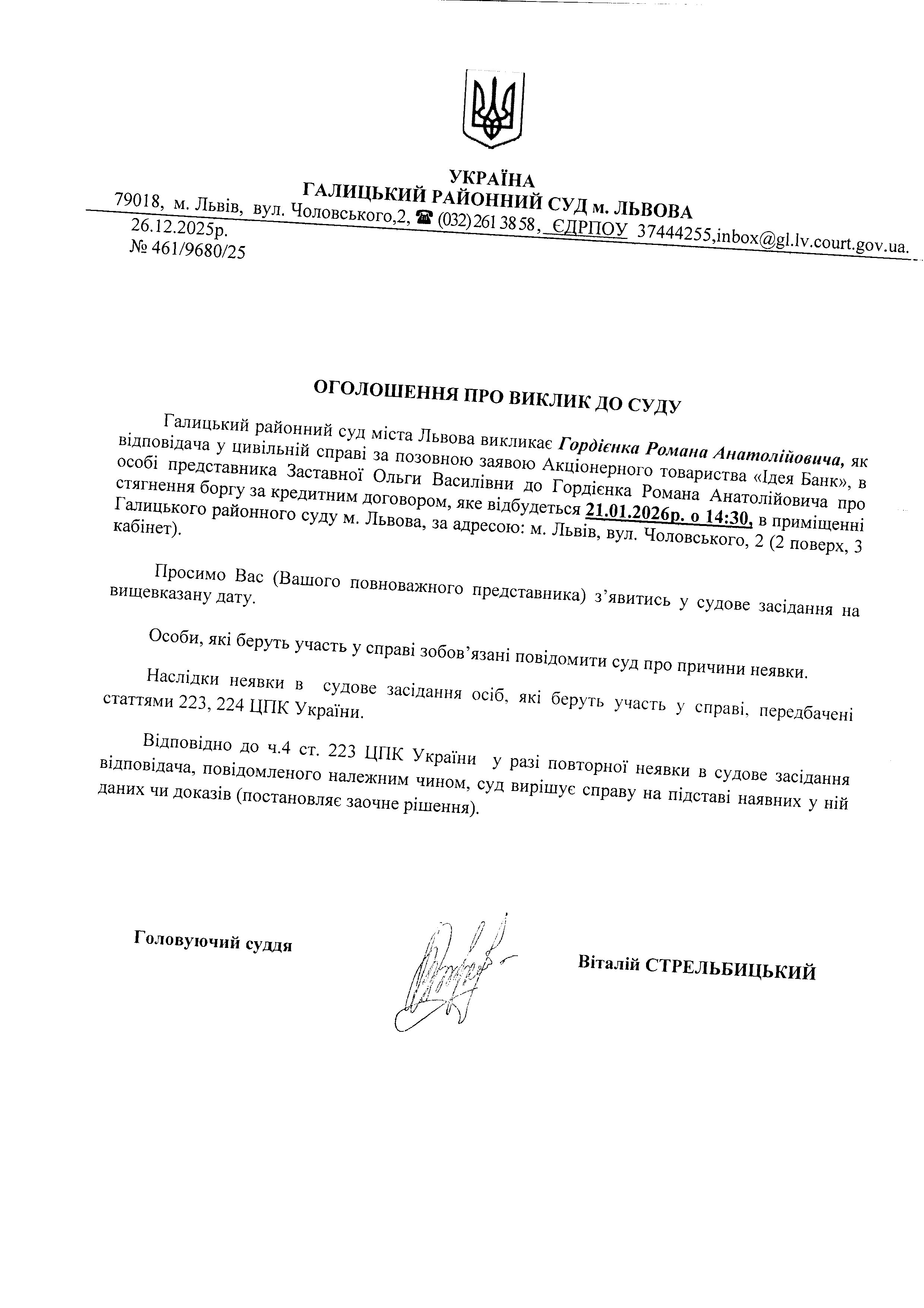 оголошення про виклик Гордієнко Р.В.