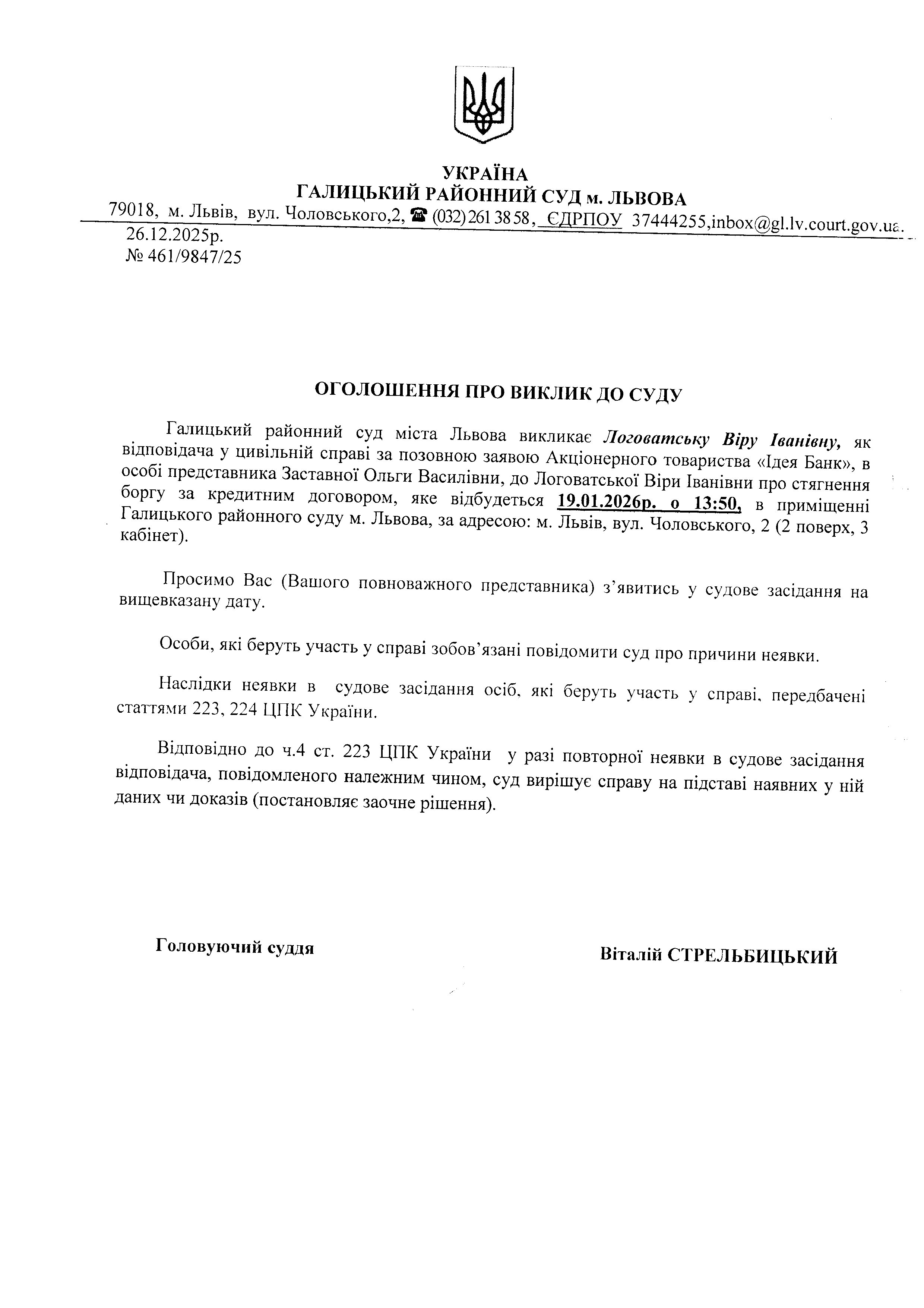 оголошення про виклик Логоватську В.І.