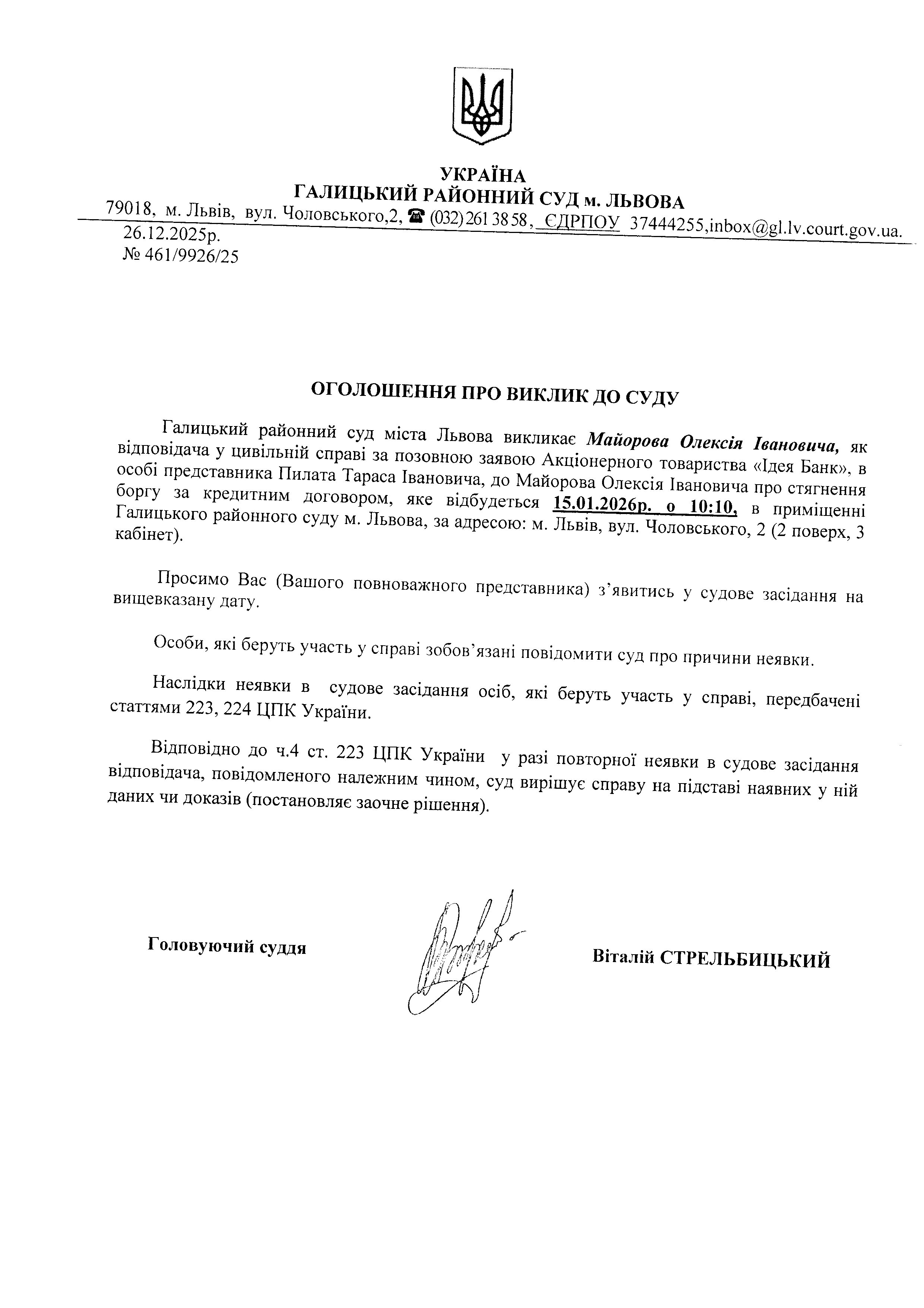 оголошення про виклик Майорова О.І.