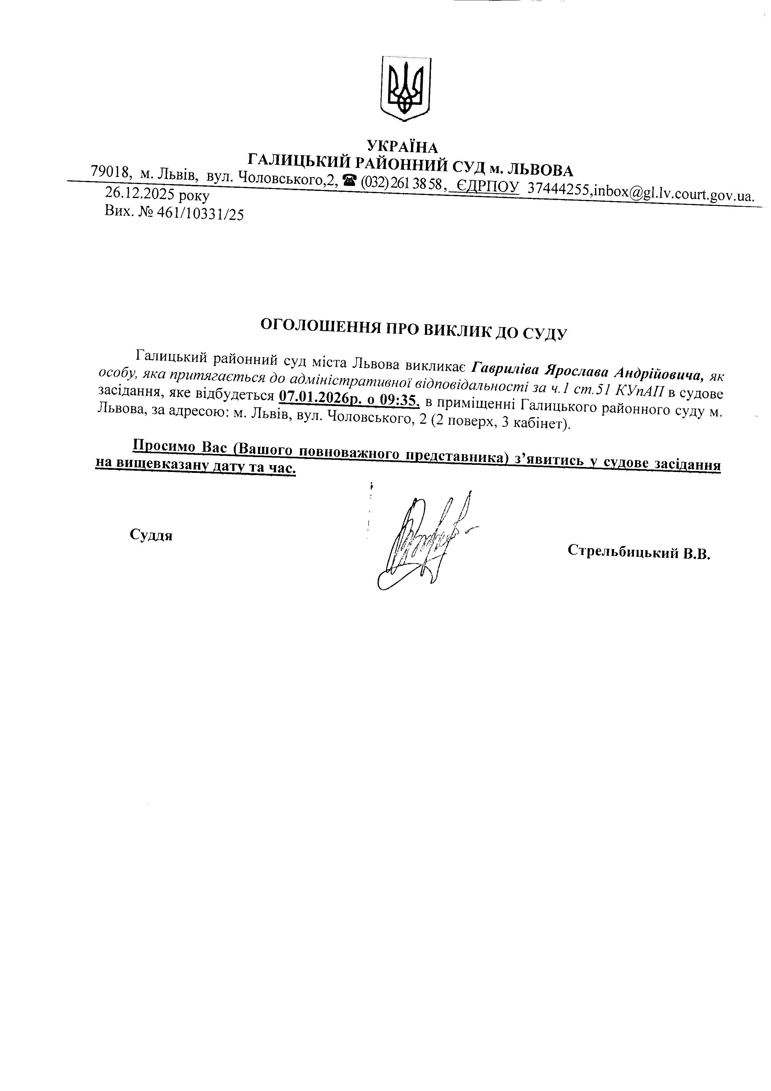 оголошення про виклик Гавриліва Я.А.