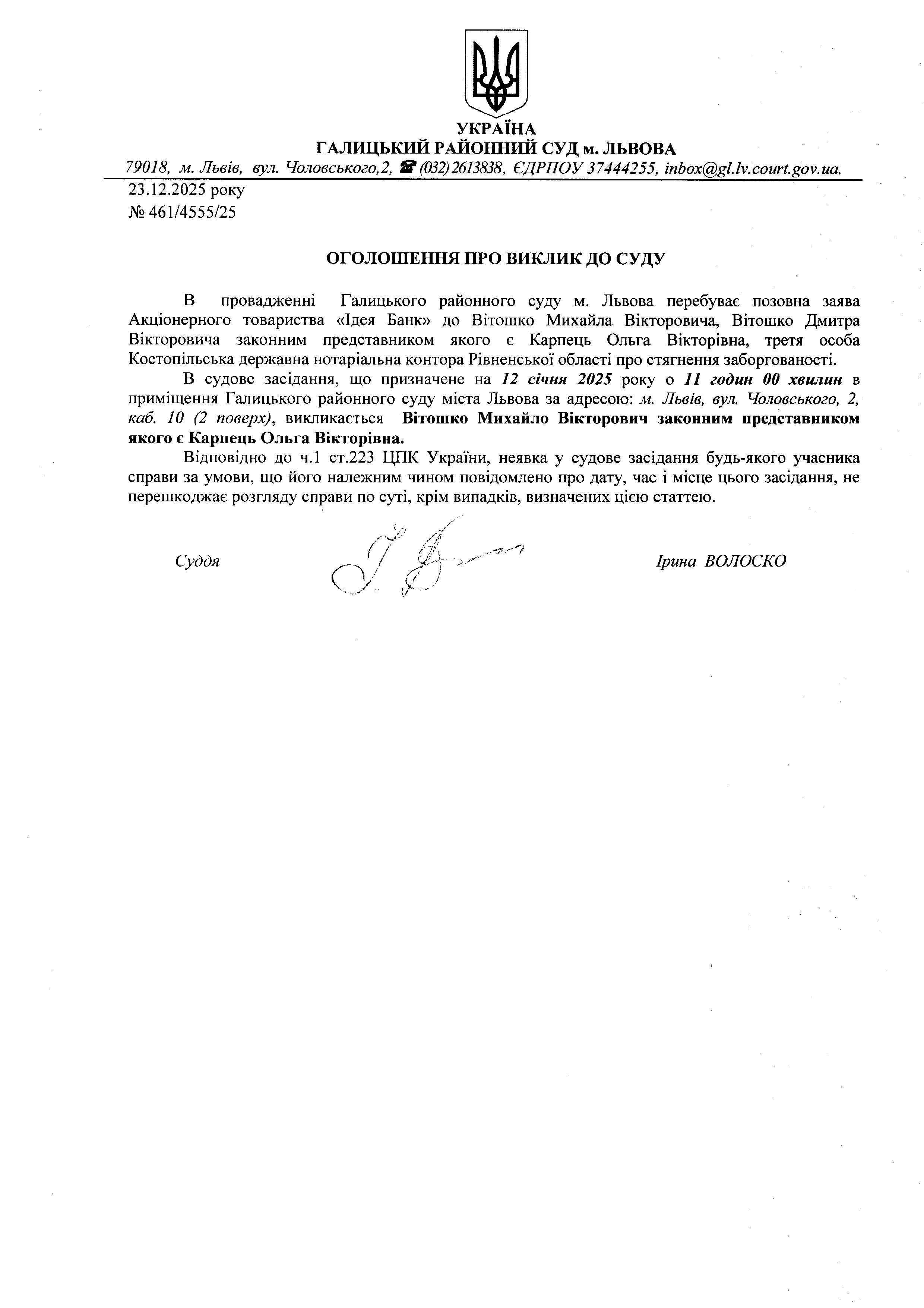 оголошення про виклик Вітошко М.В.