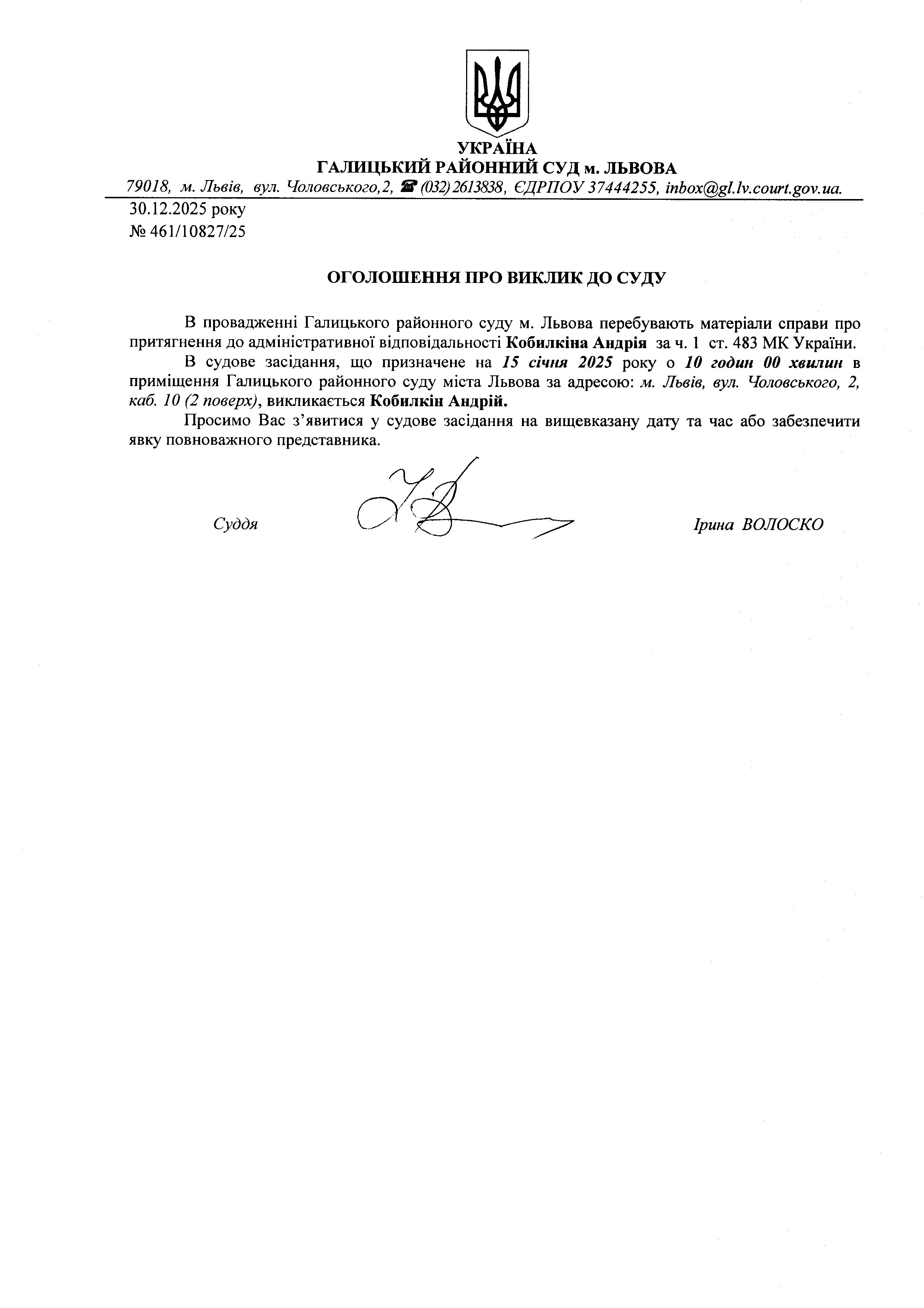 оголошення про виклик Кобилкіна А.