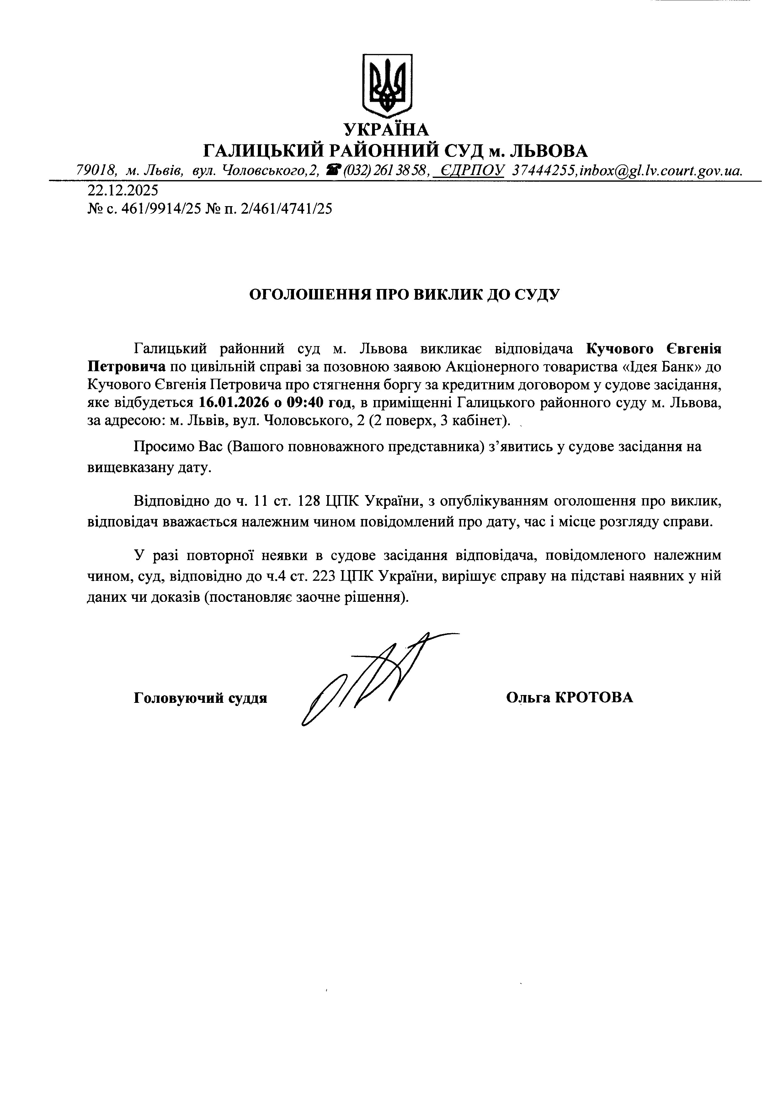 оголошення про виклик Кучового Є. П.