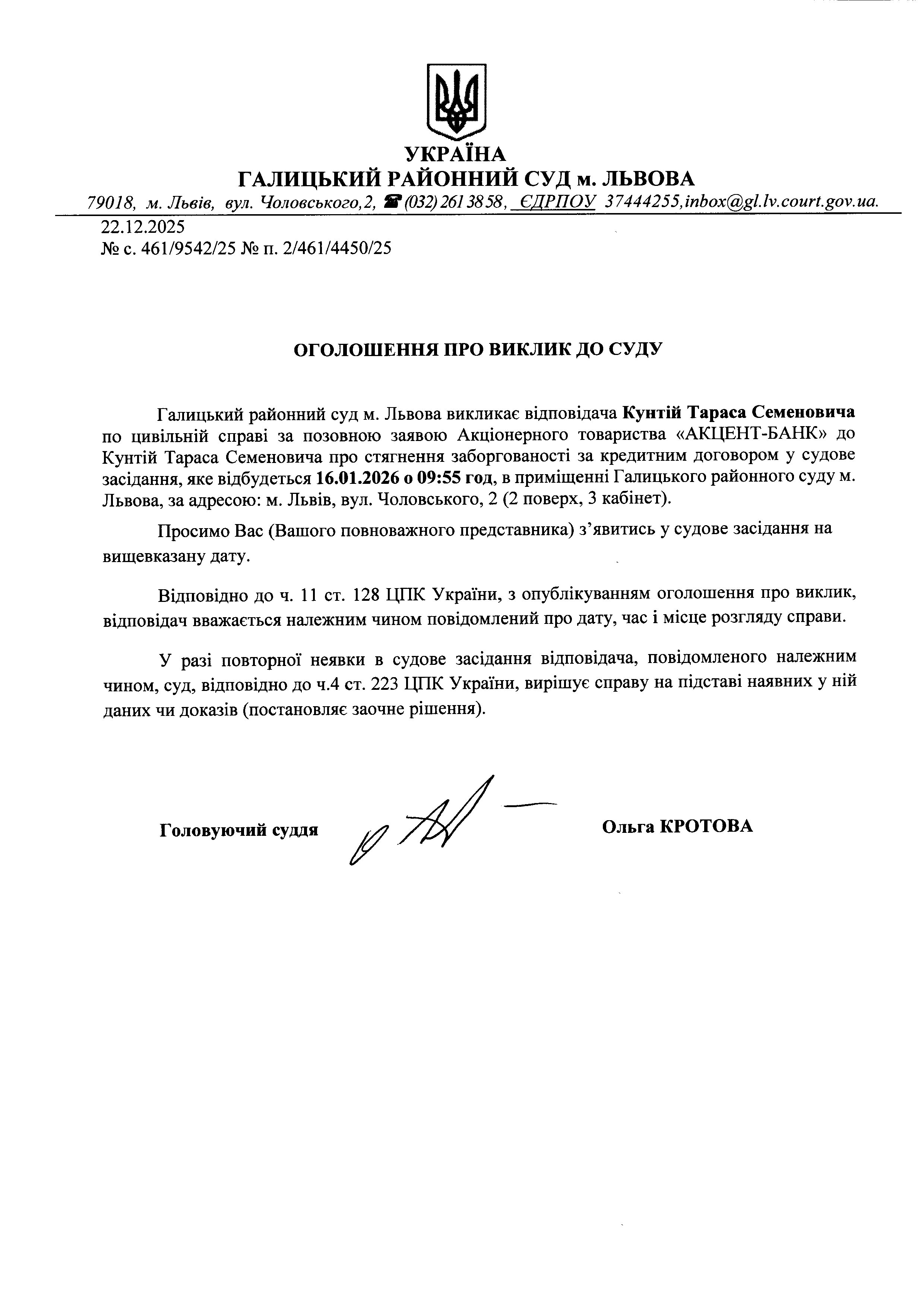 оголошення про виклик Кунтій Т.С.