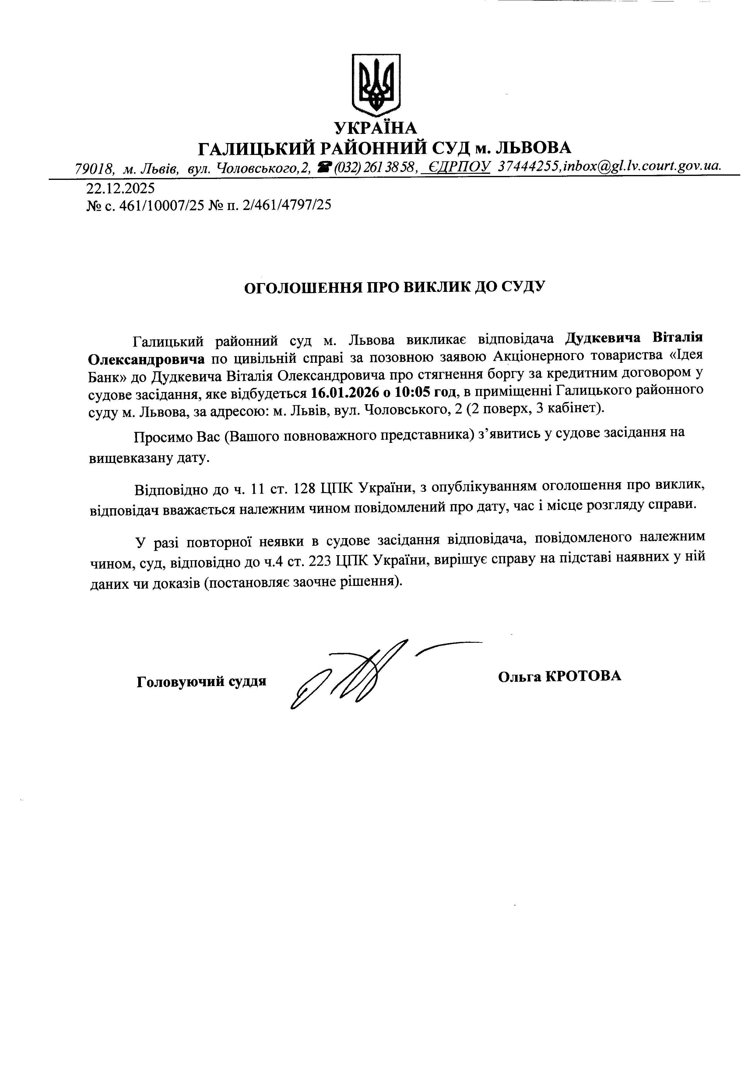 оголошення про виклик Дудкевича В.О.