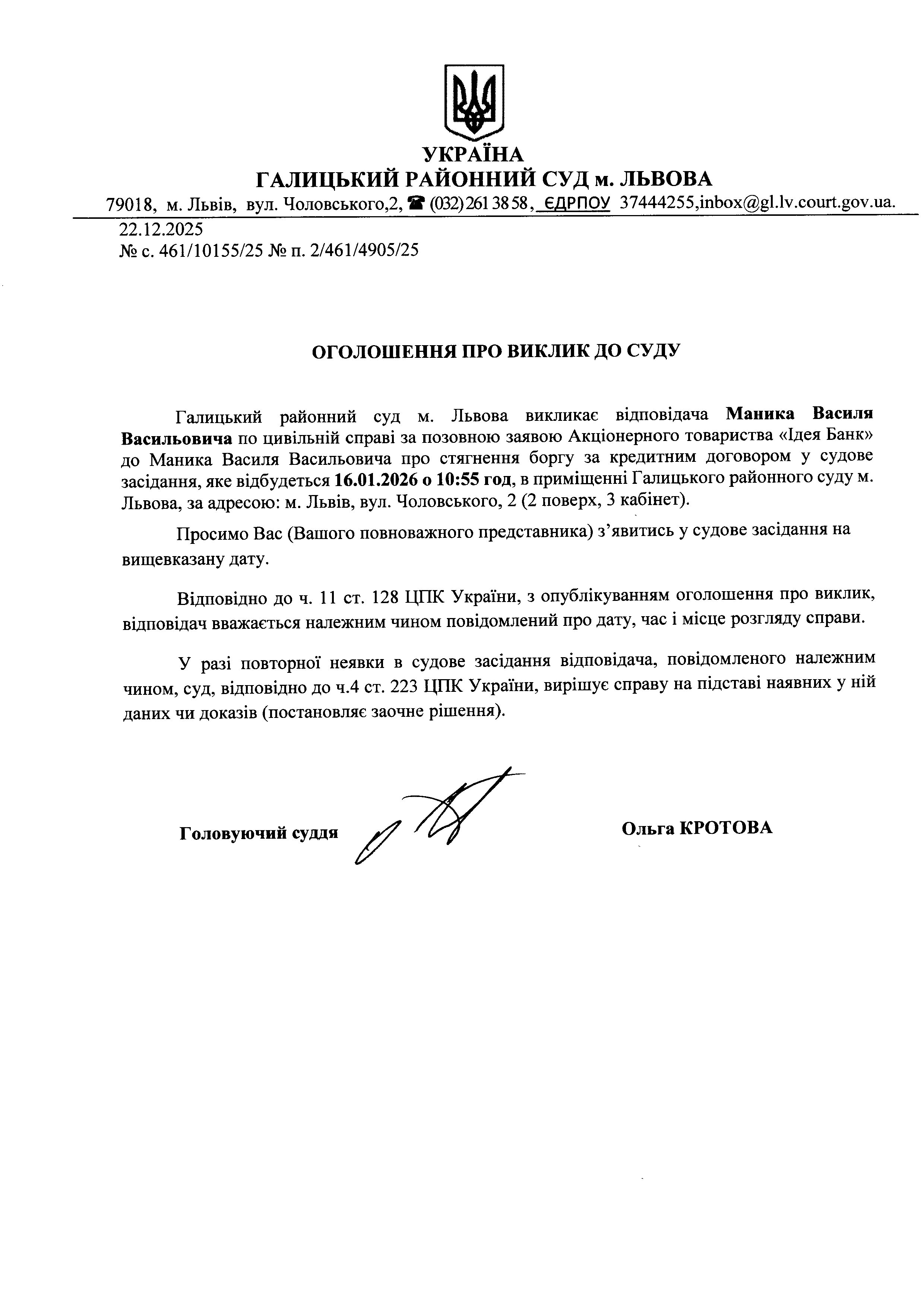 оголошення про виклик Маника В.В.