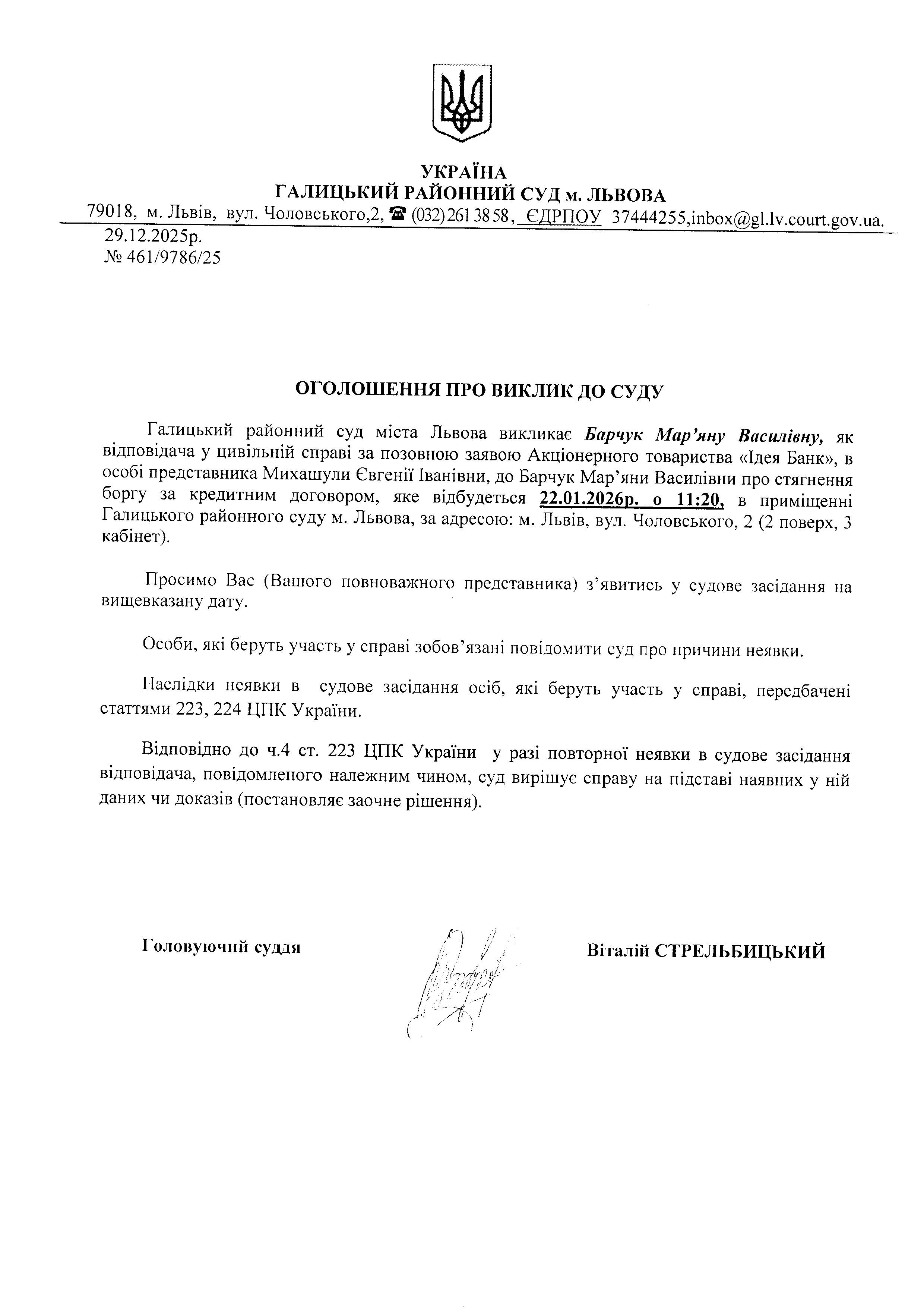 оголошення про виклик Барчук М.В.