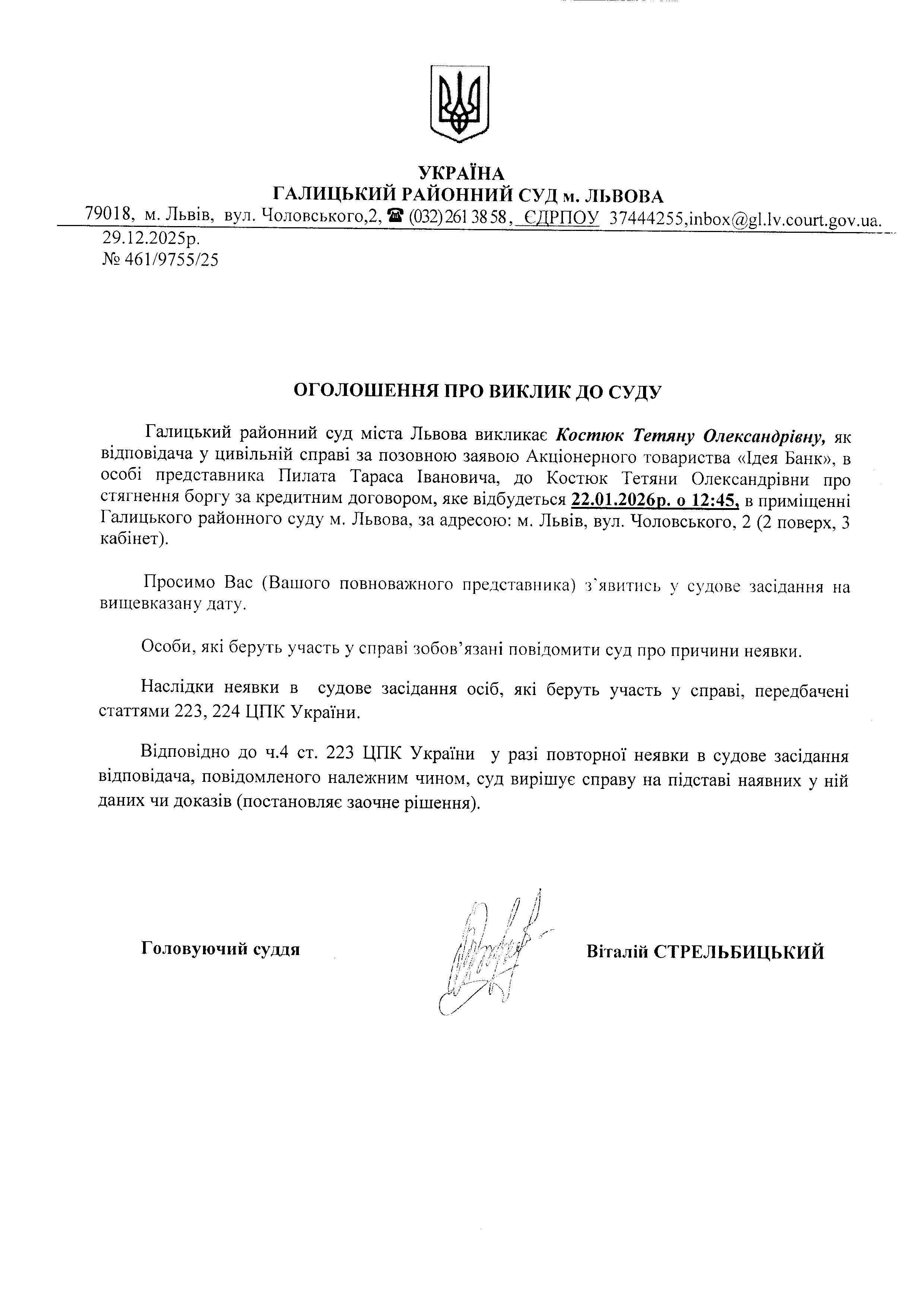 оголошення про виклик Костюк Т.О.