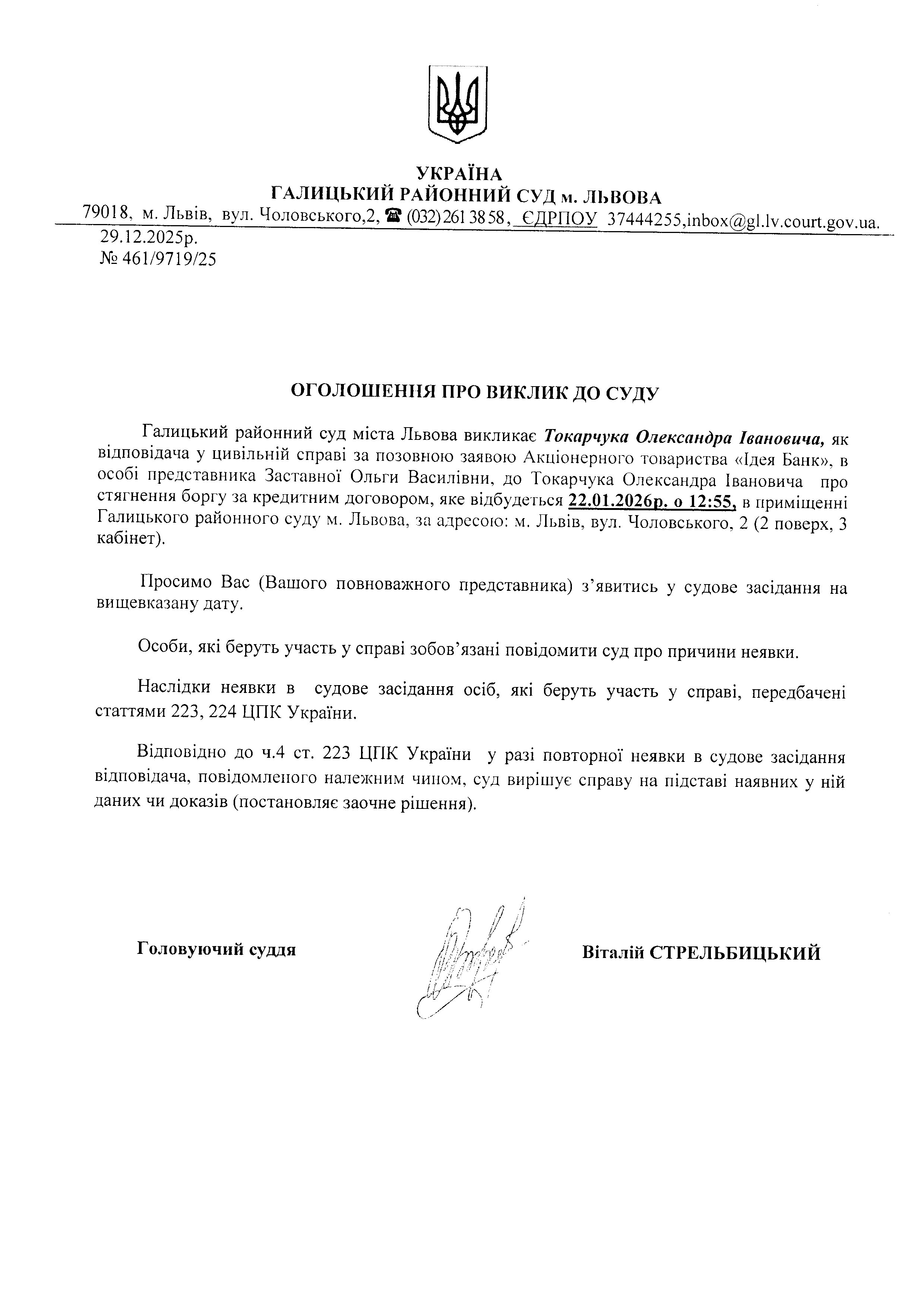 оголошення про виклик Токарчук О.І.
