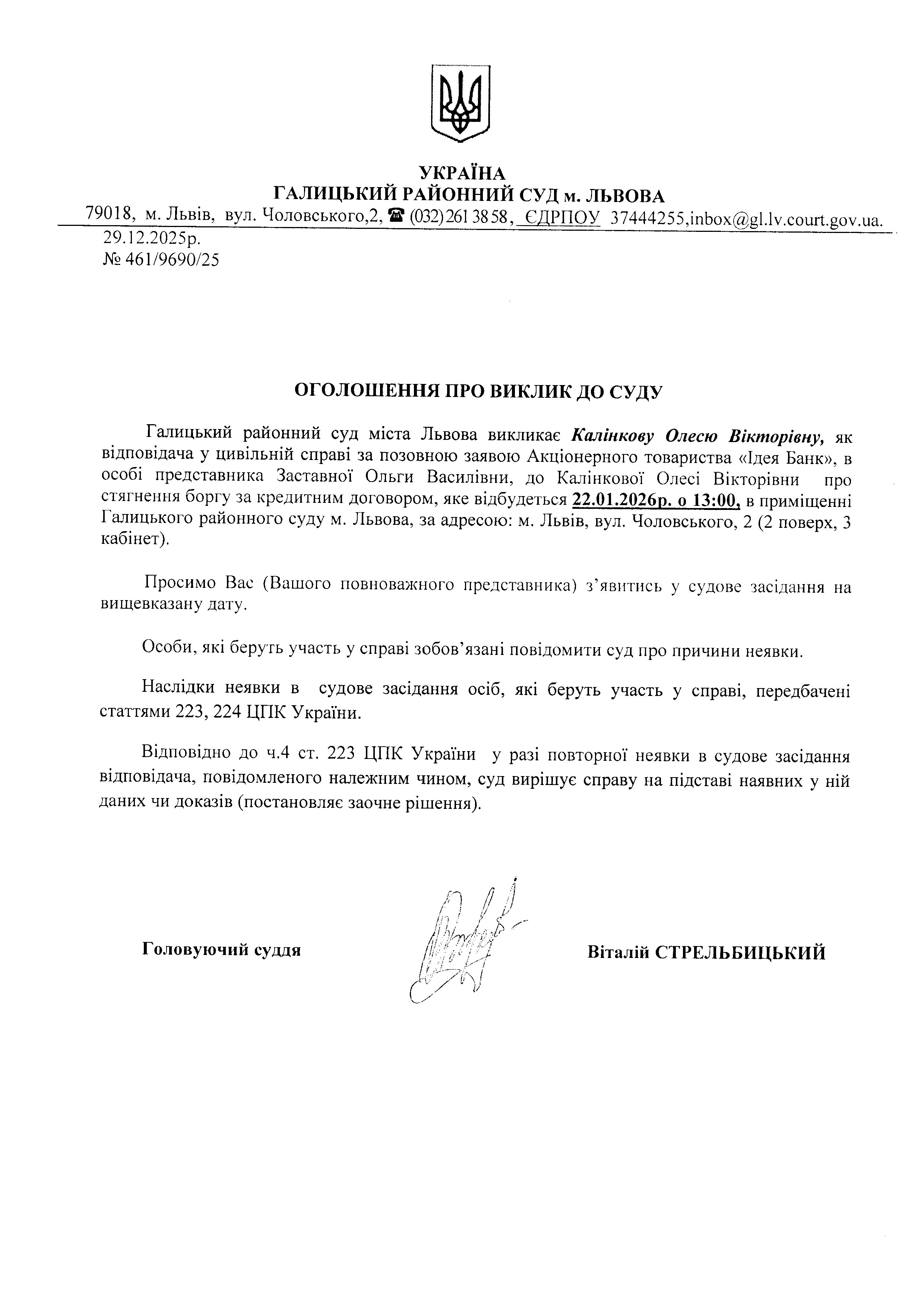 оголошення про виклик Калінкову О.В.