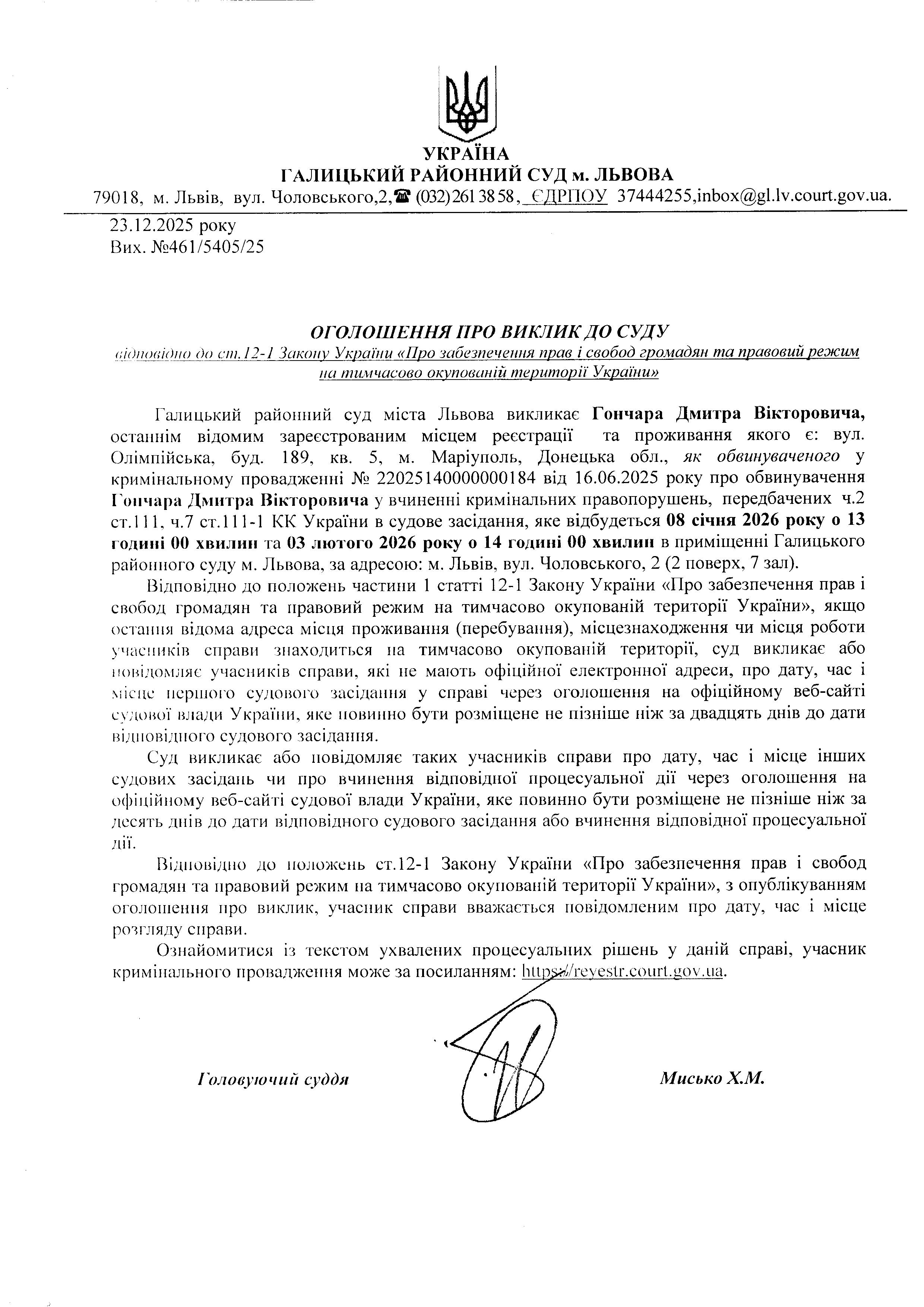 оголошення про виклик Гончара Д.В.