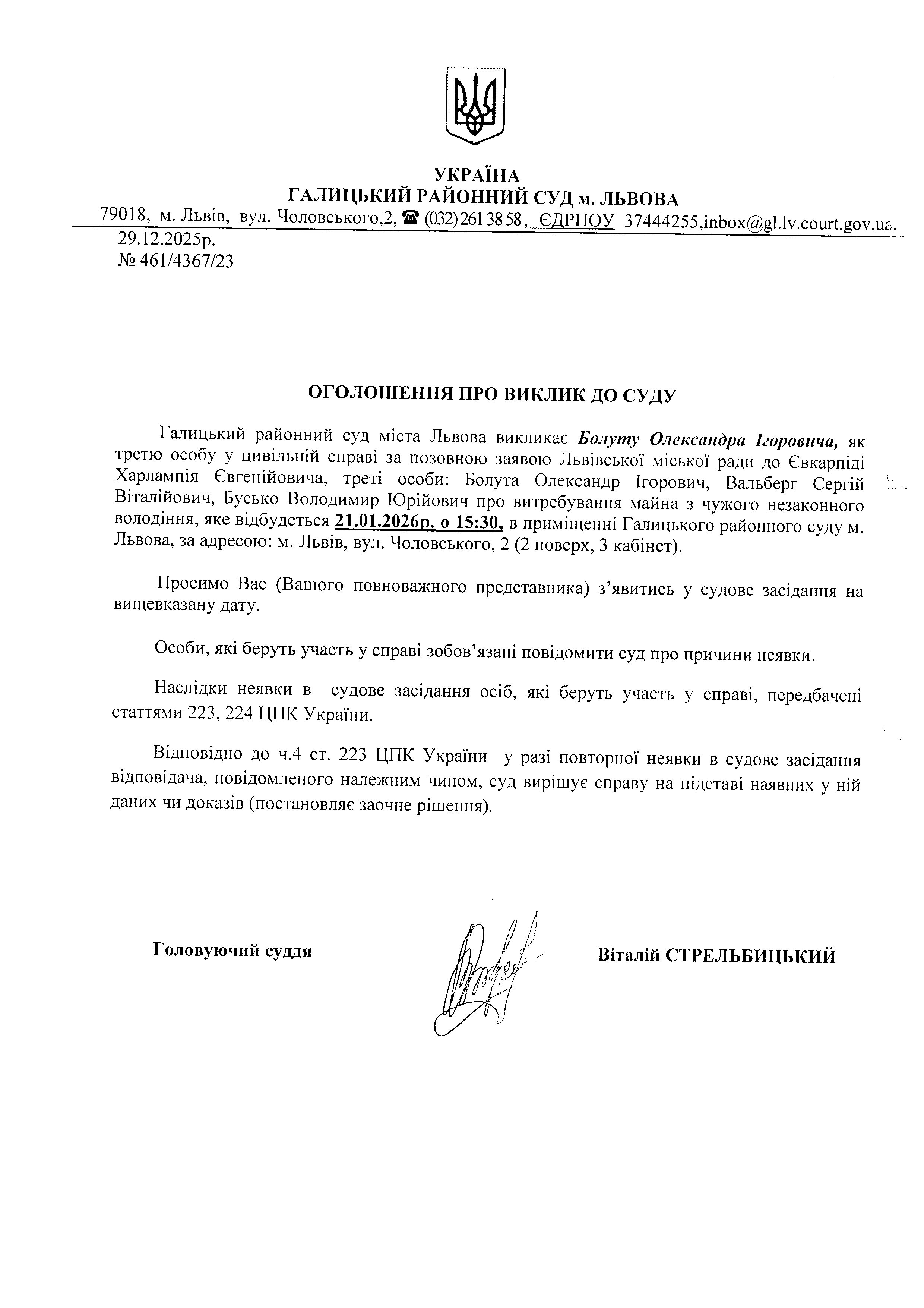 оголошення про виклик Болуту О.І.