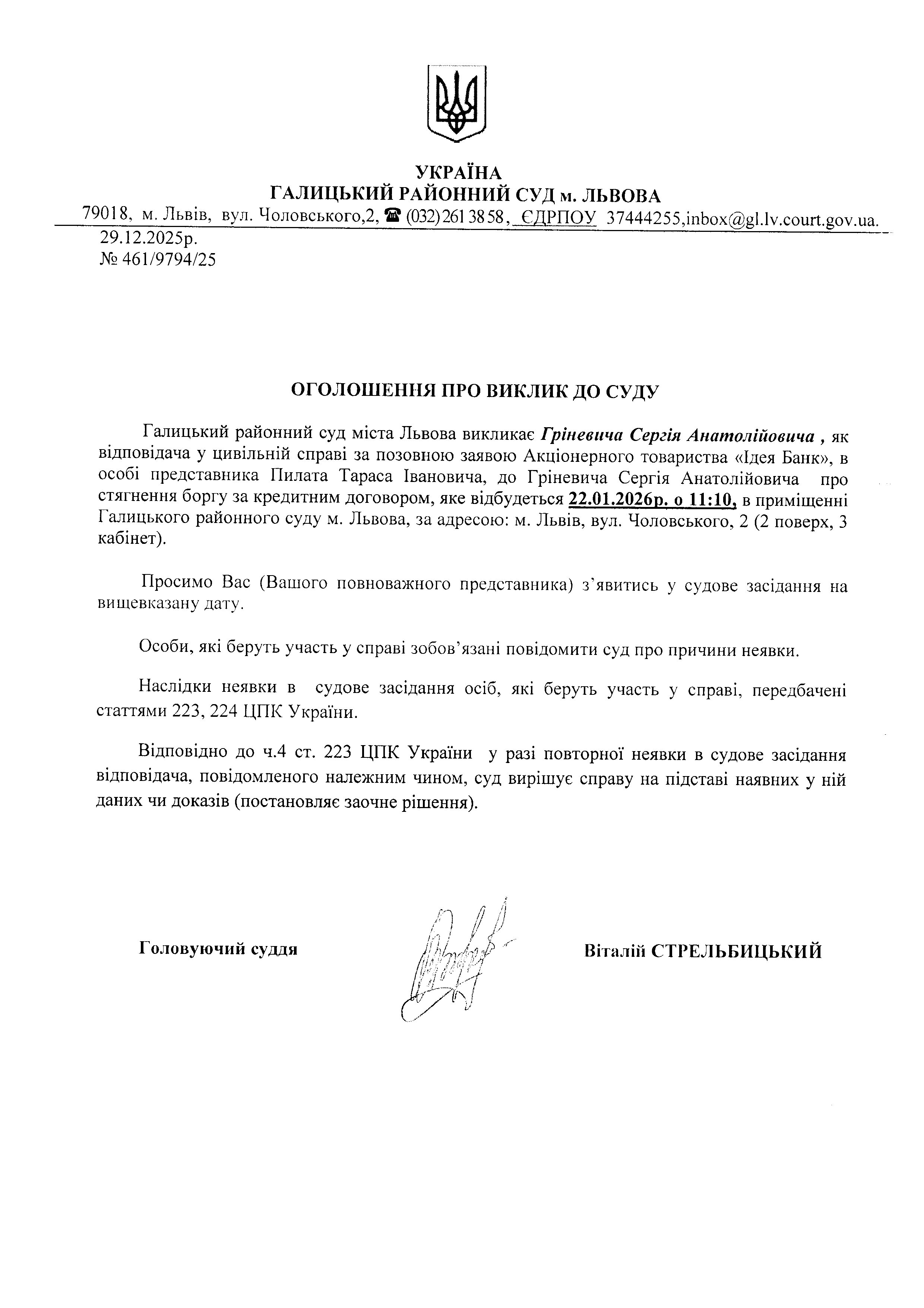 оголошення про виклик Гріневича С.А.