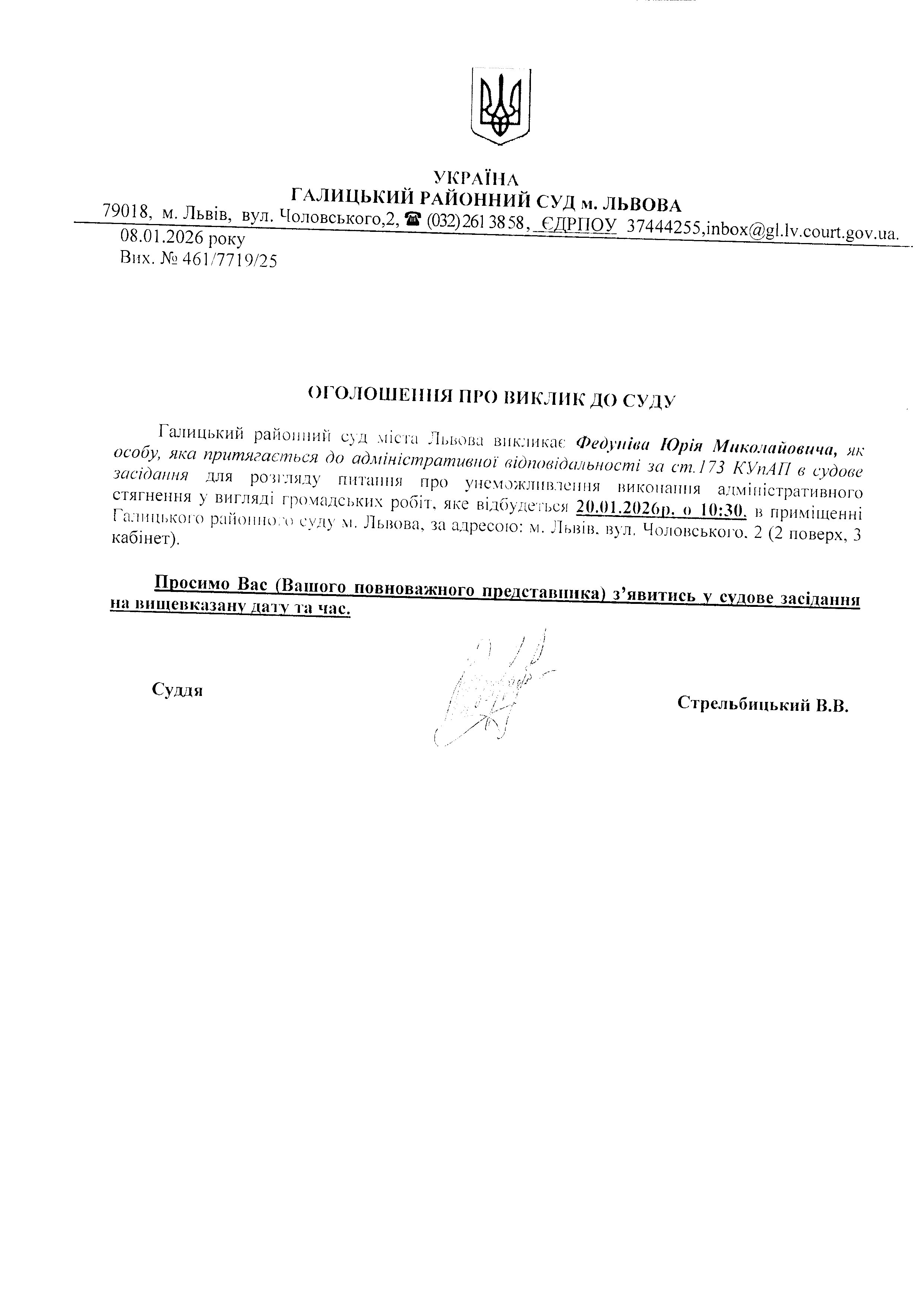 оголошення про виклик Федуніва Ю.М.