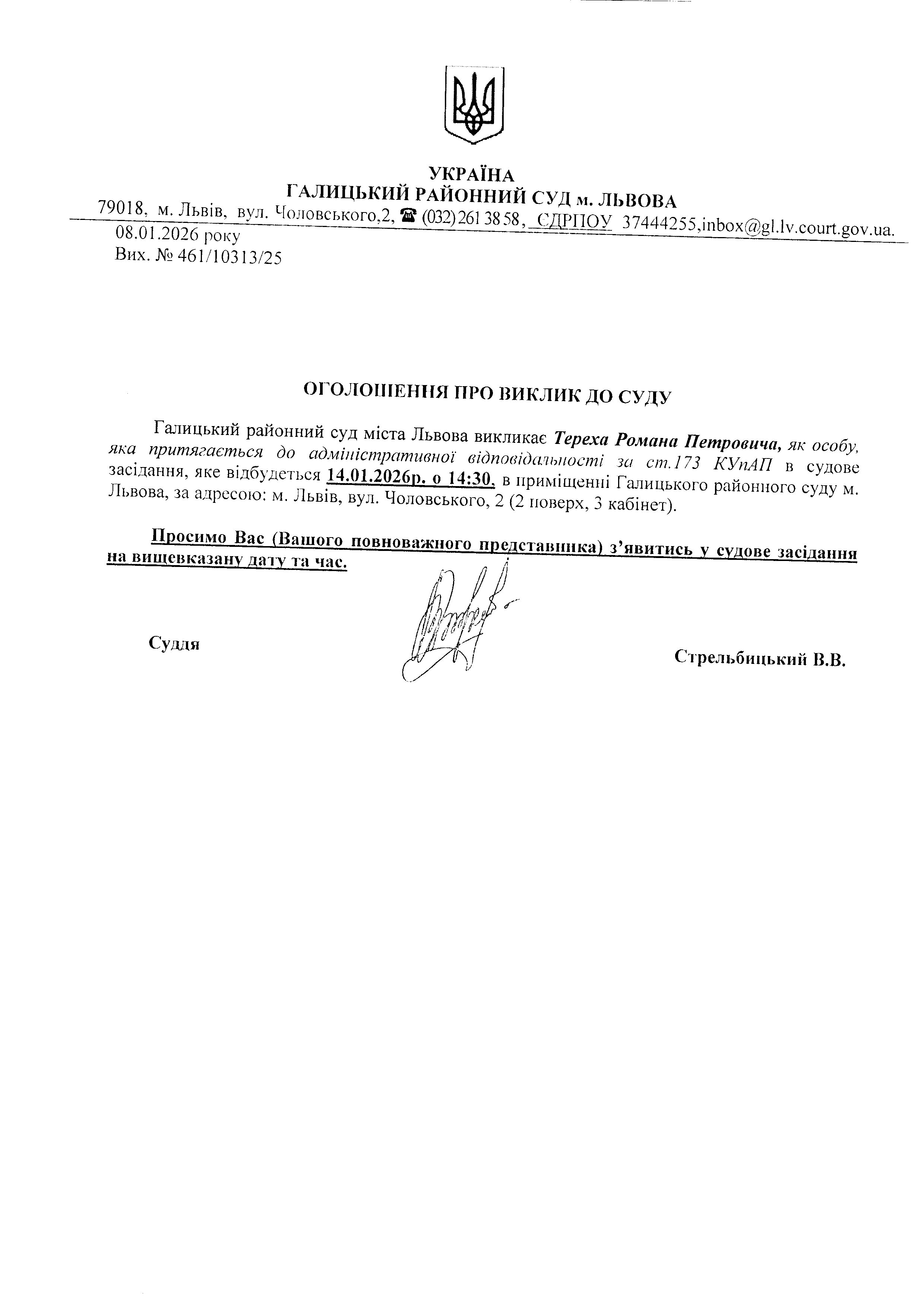 оголошення про виклик Тереха Р.П.