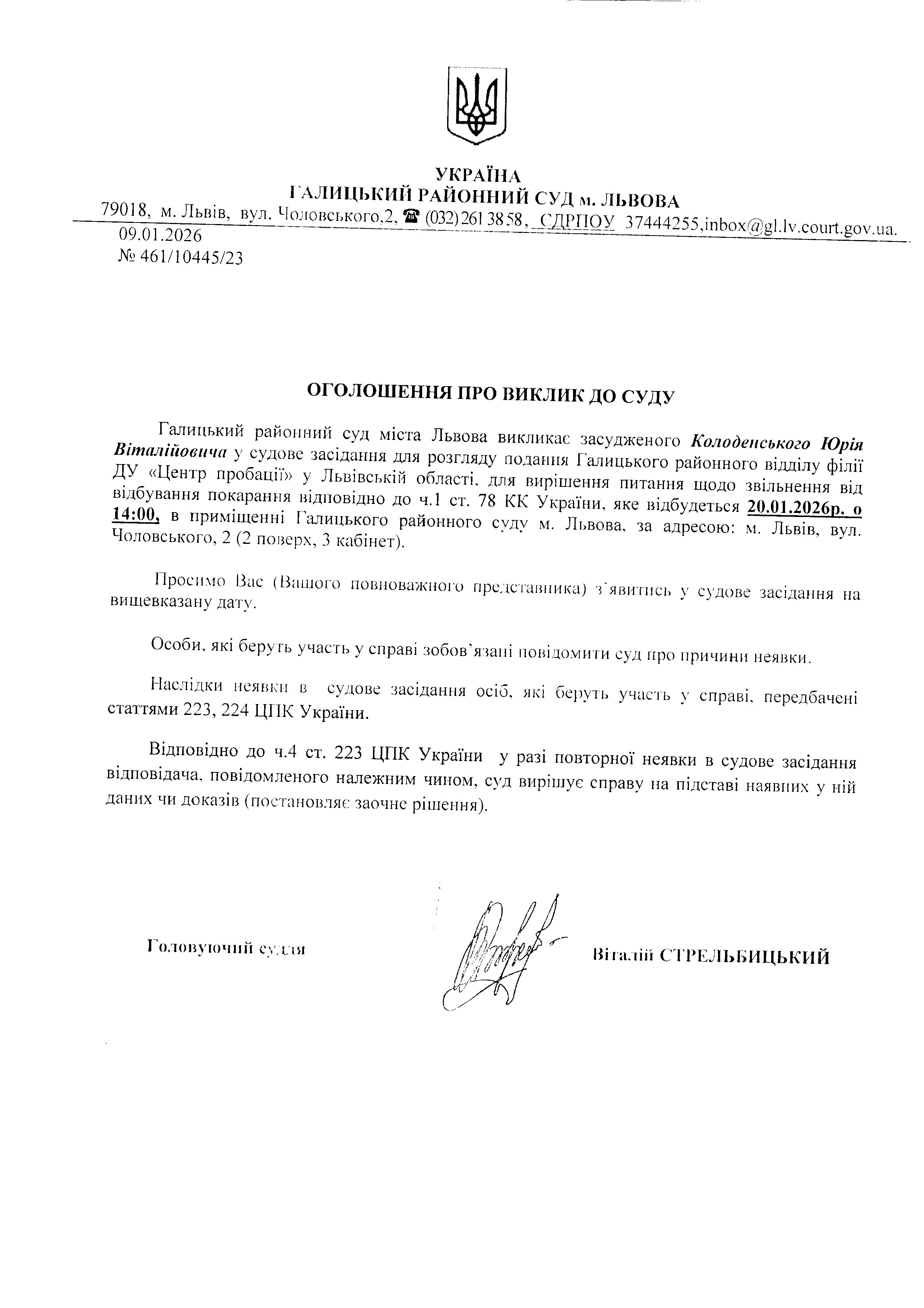 оголошення про виклик Колоденського Ю.В.