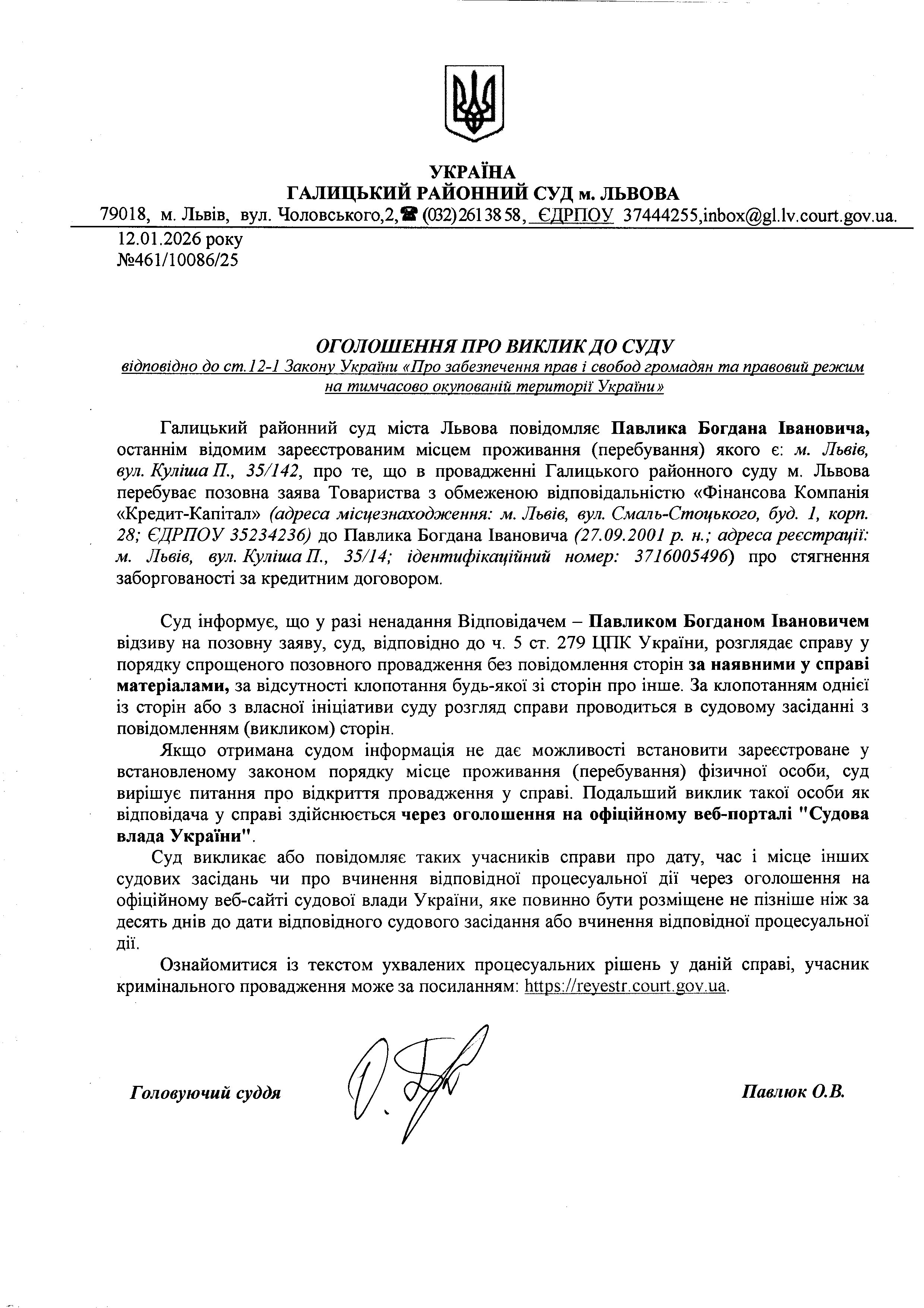 оголошення про виклик Павлик Б.І.