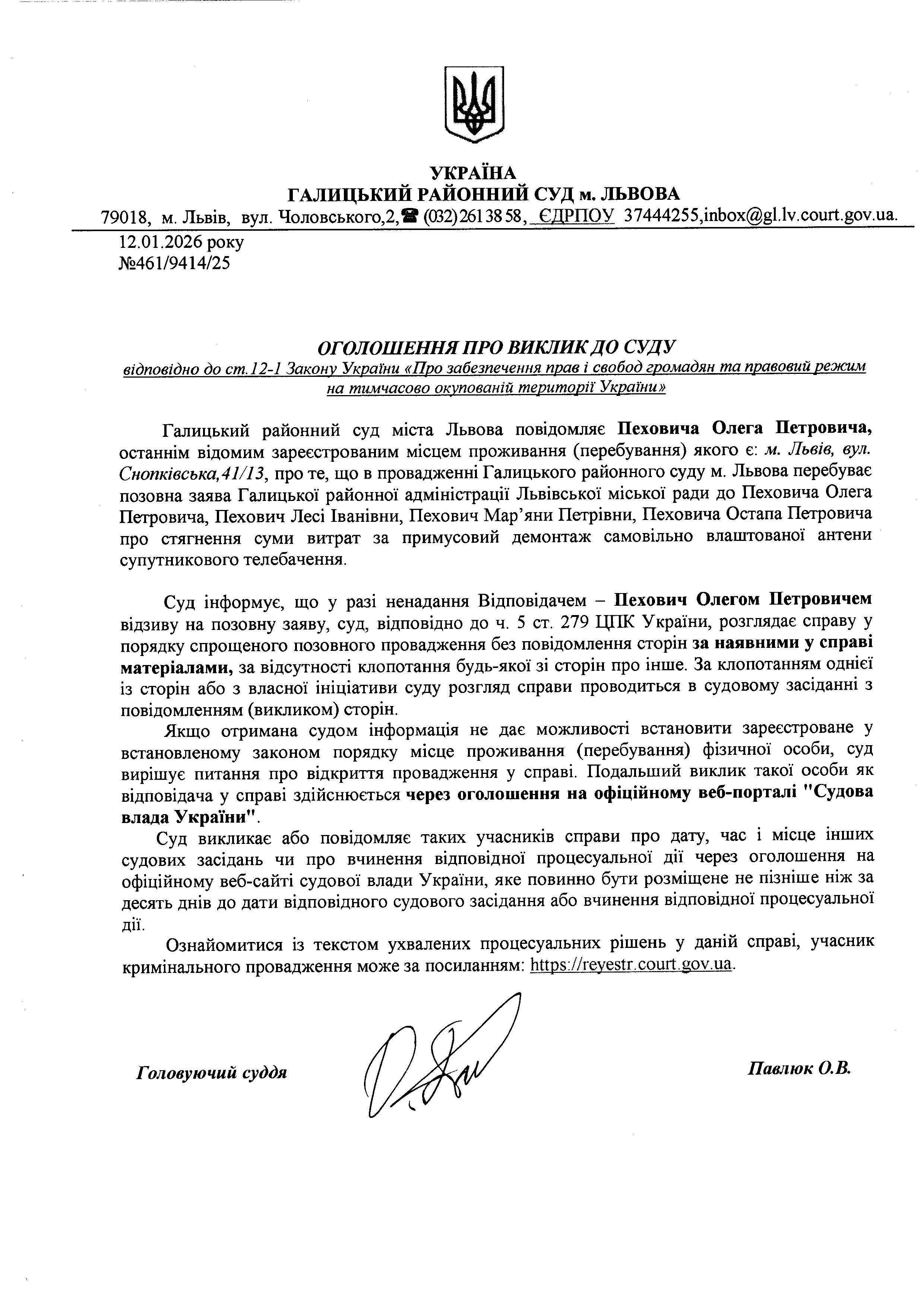 оголошення про виклик Пеховиса О.П.