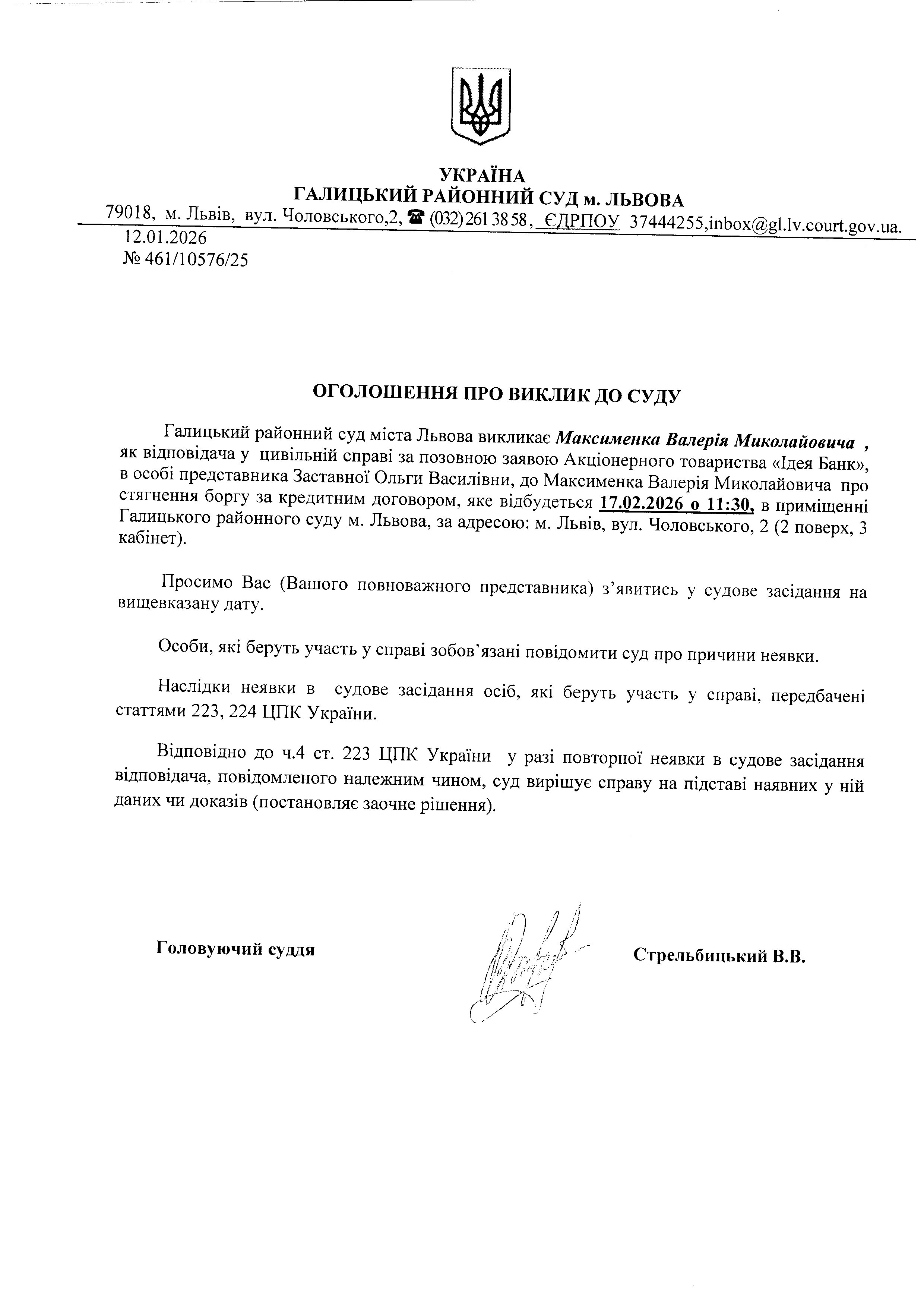 оголошення про виклик Максименка В.М.