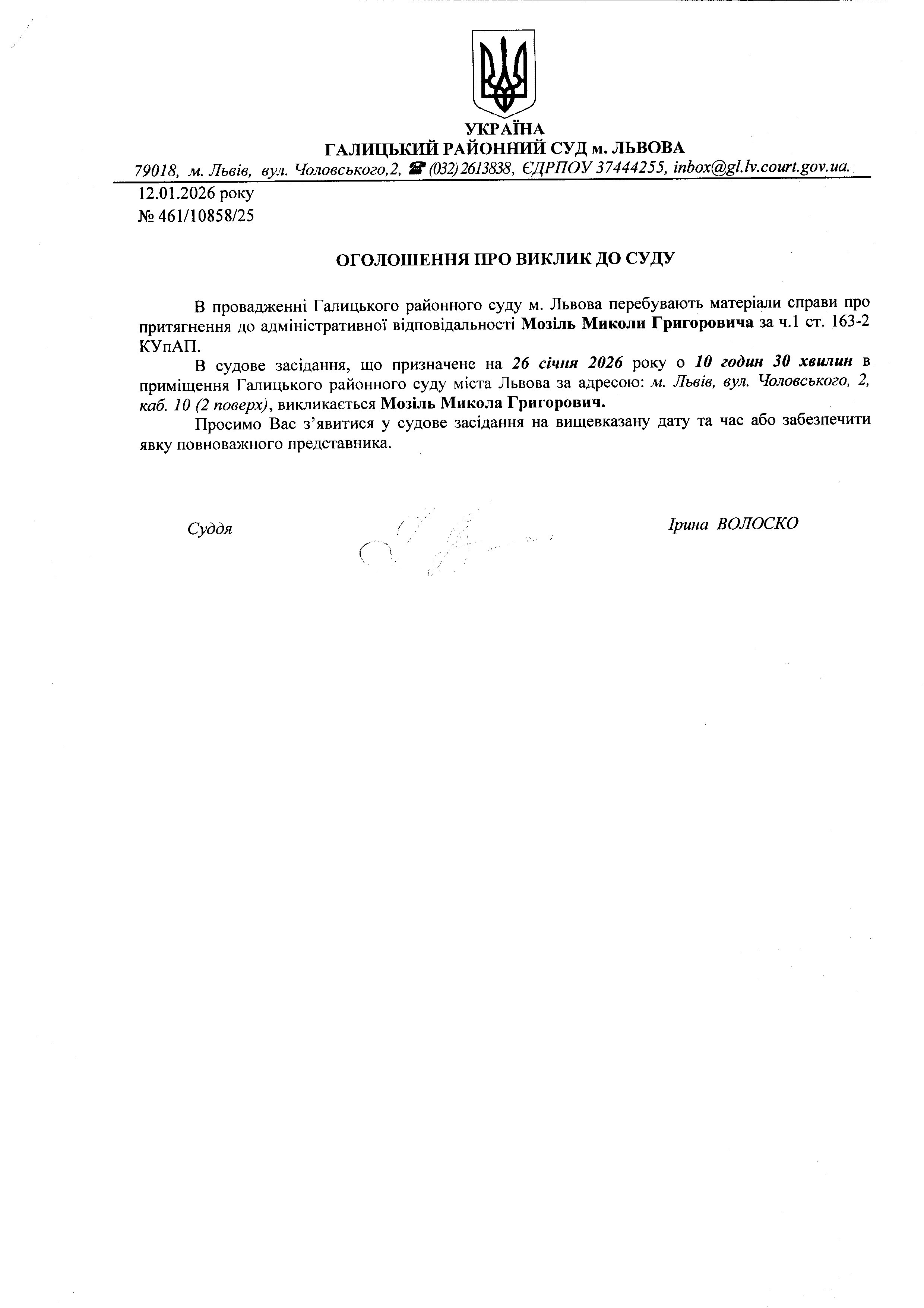 оголошення про виклик Мозіль М.Г.