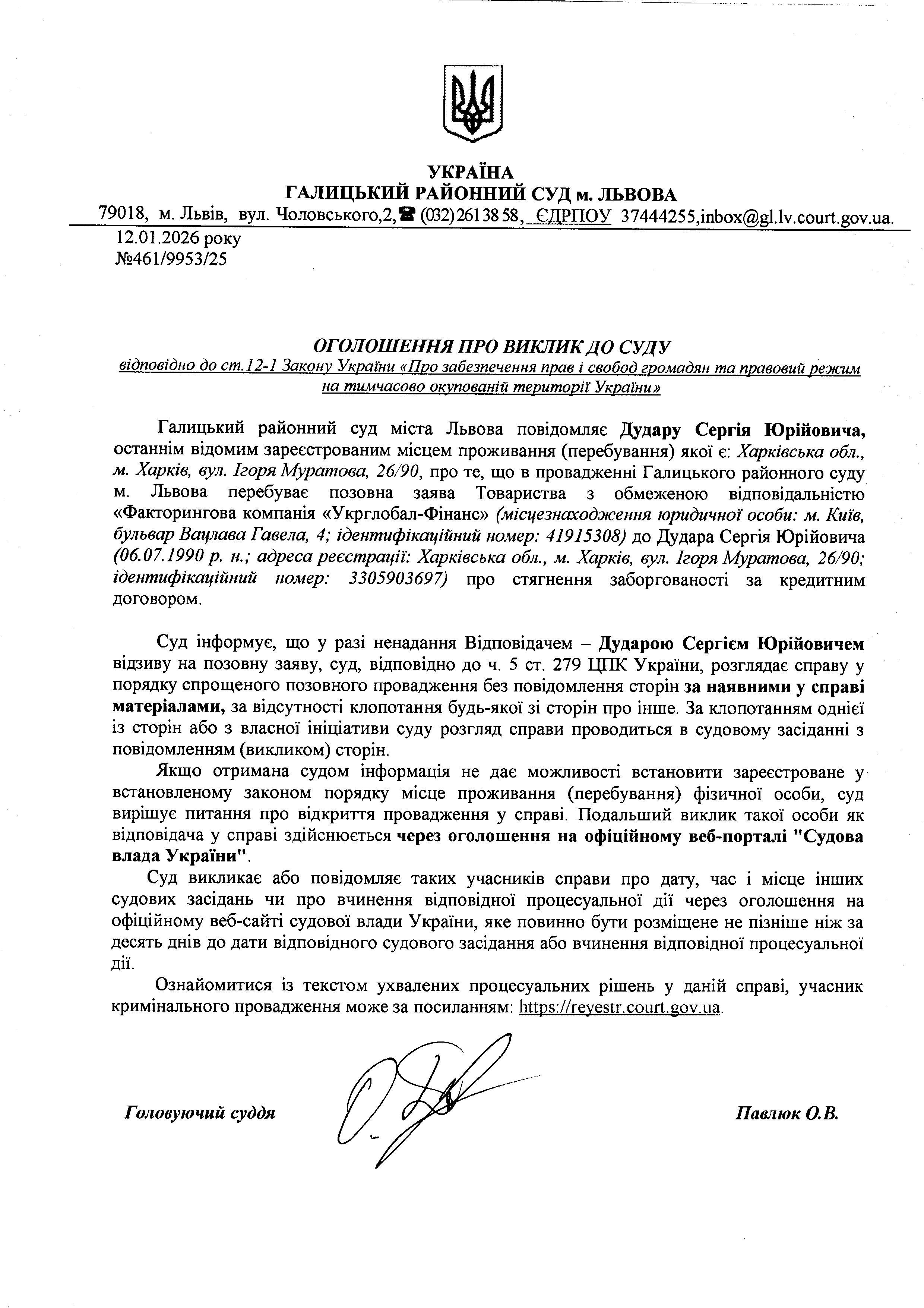оголошення про виклик Дудару С.Ю.