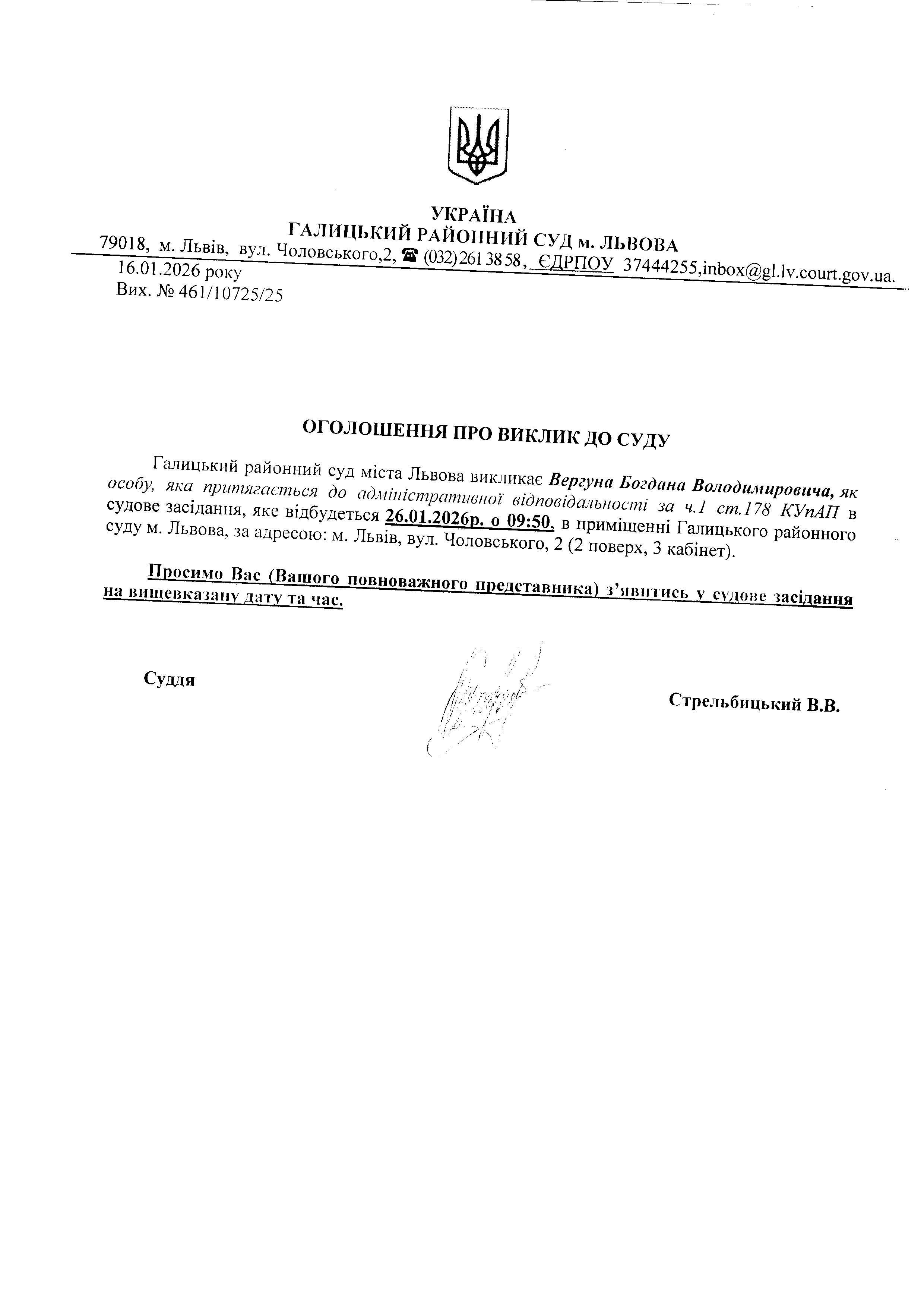 оголошення про виклик Вергуна Б.В.
