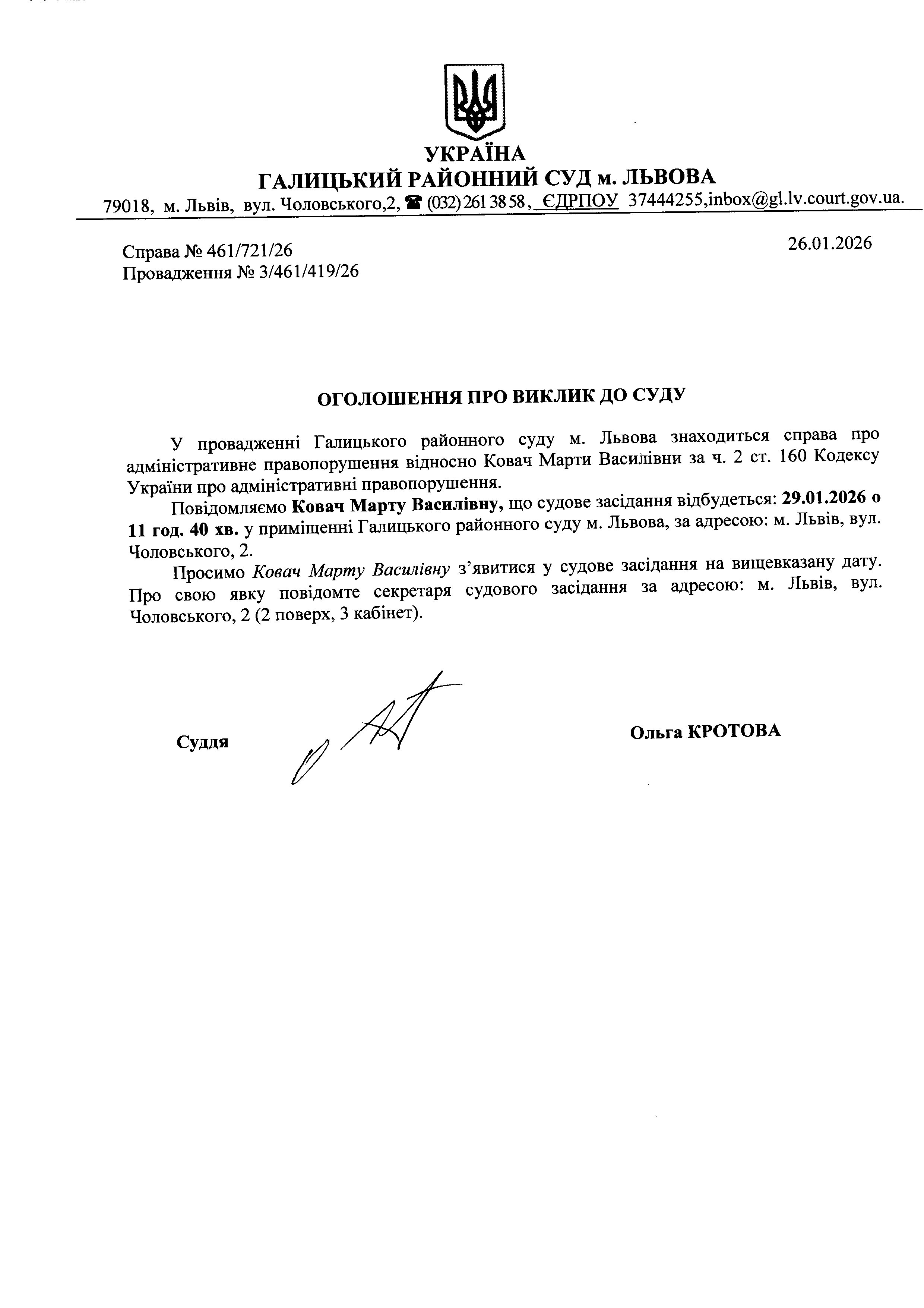 оголошення про виклик Кавач М.В.
